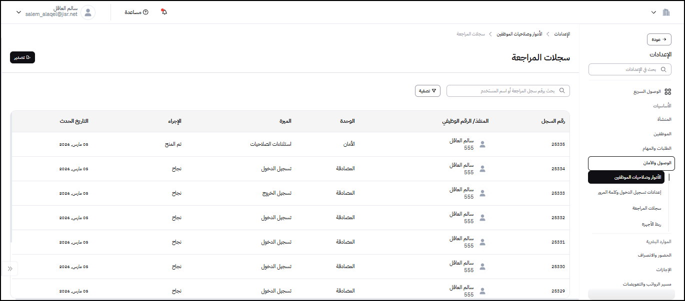 ملحوظة: يمكن للمستخدم الاطلاع على سجلات المراجعة والاطلاع على كل العمليات التي تمت في نظام إدارة الصلاحيات والأمان.