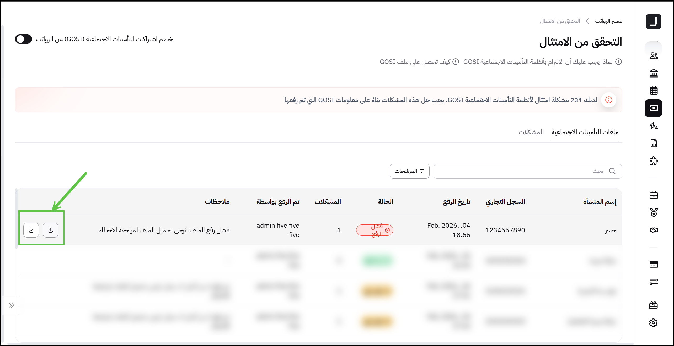 3- In case dismissing the GOSI notifications and proceeding with payroll processing and the Establishment Compliance Ratios were affected due to the violations, the Entity is required to justify the violations at the Compliance System (Mudad platform).