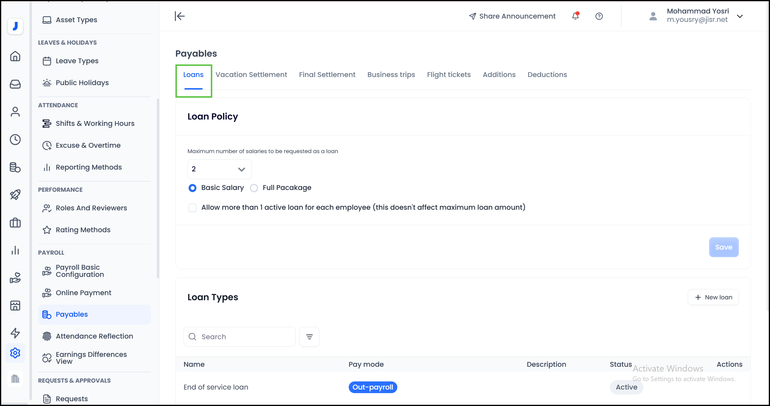 In order for the self-service loan requests automation process on the system to function correctly, it is important to set and define the types of loans available for employees to apply for, so that these types appear to employees when submitting a request, in addition to their direct impact and the reflection of their deductions on the payroll.