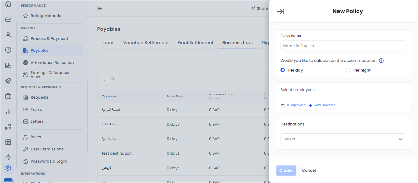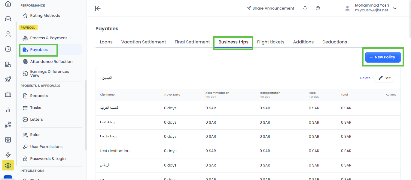 In order to benefit from the feature of automating the process of calculating the receipts for business trips or assignments on the Jisr system, the system admin or the person with authority must first define and add the facility’s policy for business trips, by following the following steps: