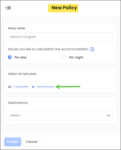 The system admin can define more than one policy through the option (Add a new policy) and set a special name for each policy, in addition to choosing the employees to whom the policy applies, assigning destinations, and finally defining the daily amounts for each destination.