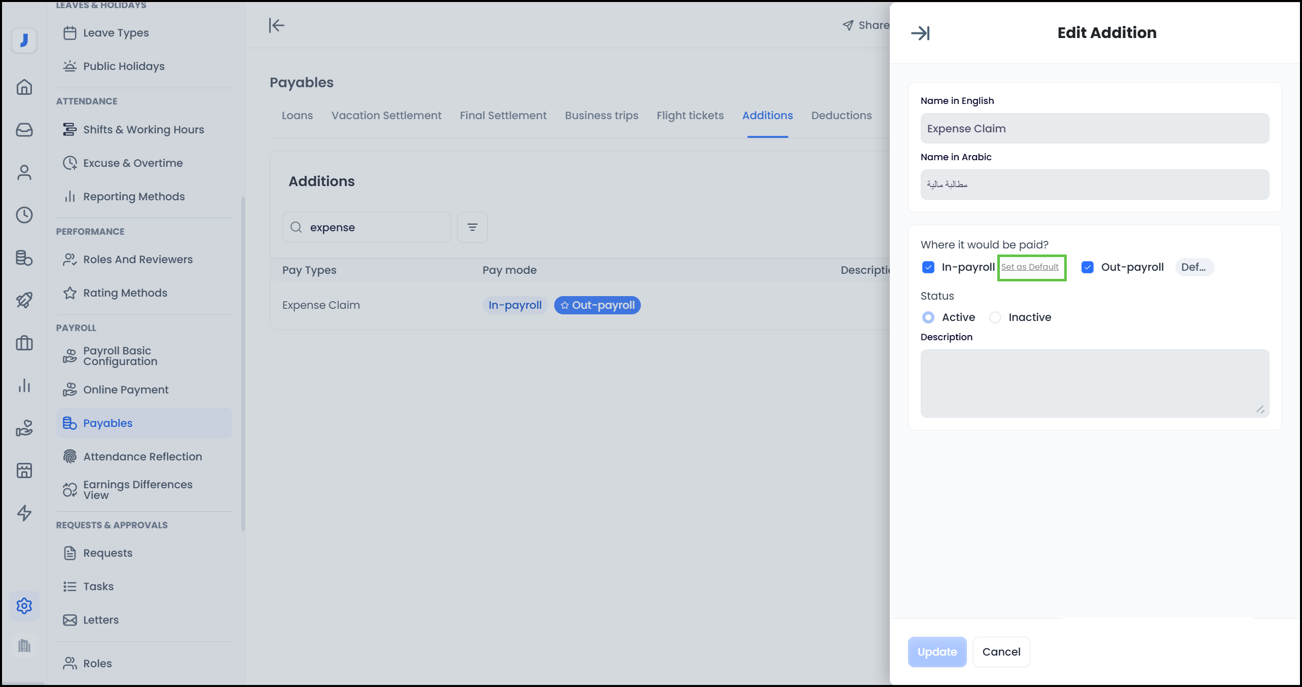 Settings > Payroll > Payables tab > Additions tab > Expense Claim > Set where this item will be paid by default.