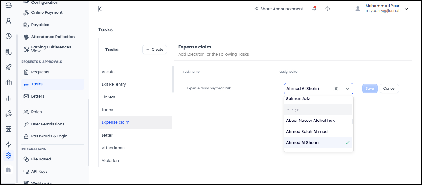 The Jisr system provides the ability to create a task and assign it to the person responsible for paying the expense claim for employees.