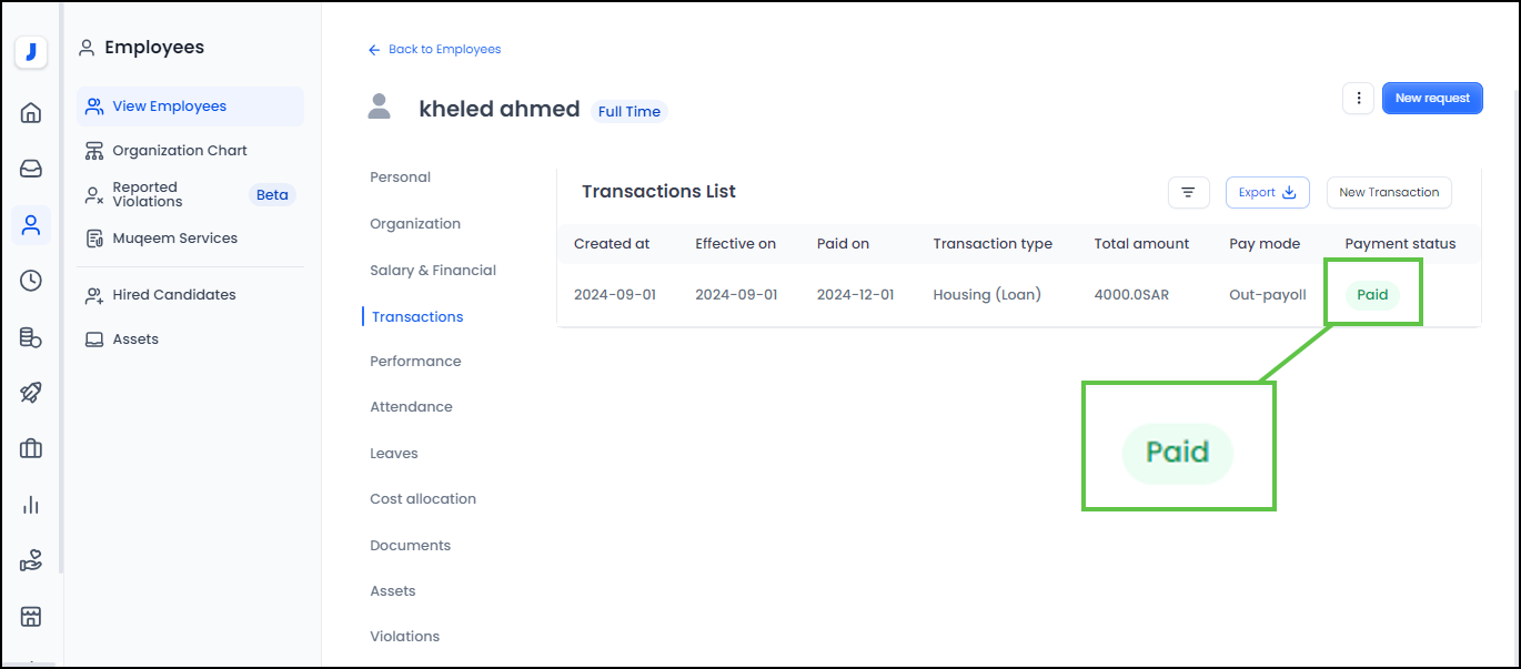 If there are Loans in the employee's personal file (its status is open), the monthly installments will not be deducted from the salary until the payment is confirmed on the system, and thus its status will change from open to paid, by going to the financial transactions tab from the employee's file, and choosing (Complete payment).