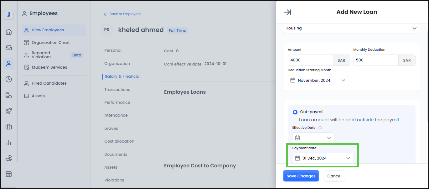 If the loan amount has been paid and transferred to the employee (outside the payroll), enter the payment date (so that the loan status becomes paid), so that the monthly installments can be deducted from the employee's salary.
