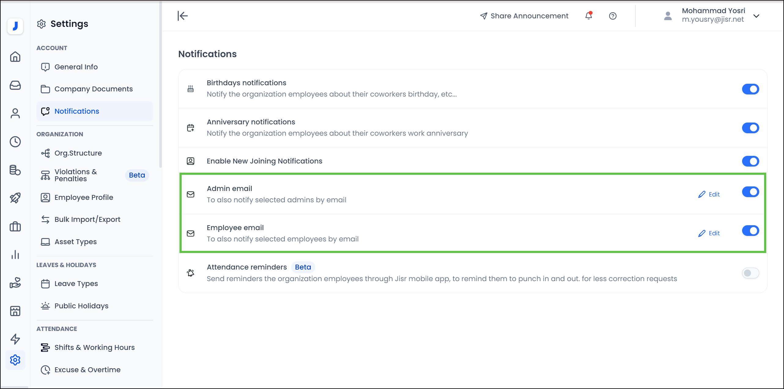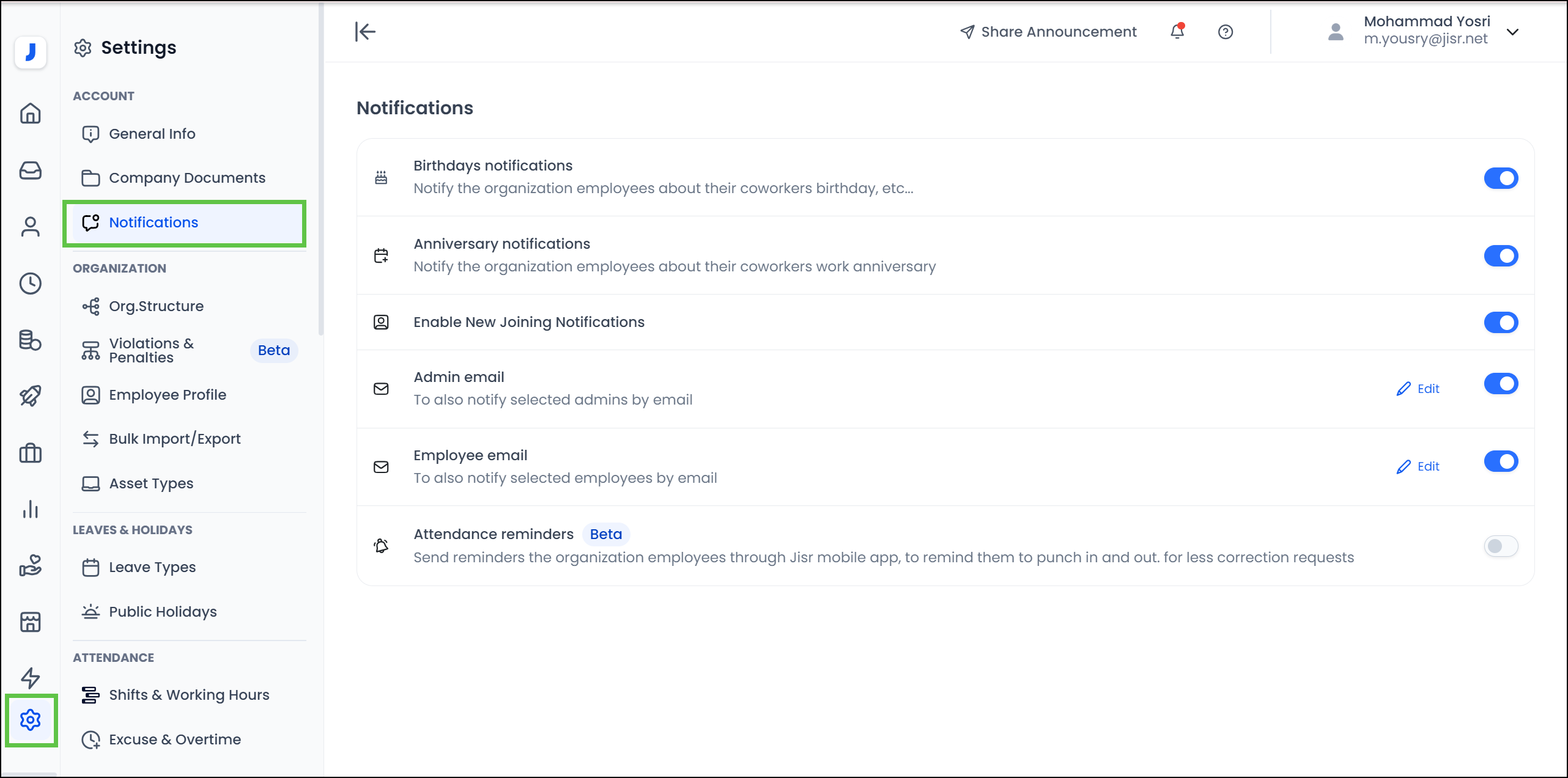 The system admin can benefit from the notification feature that the system sends to employees on the mobile application (self-service) of the Jisr system, which keeps them informed of events and occasions related to the facility’s employees. The system administrator can activate or deactivate the options in line with the culture of the internal work environment of the facility.