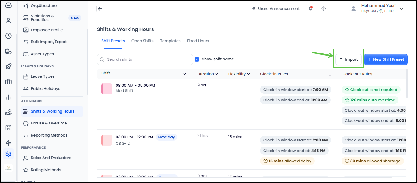 Settings >> Attendance >> Shifts & Working Hours >> Shift Presets > Import.
