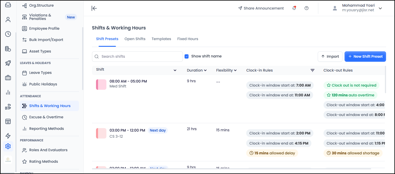By following these steps: Settings >> Attendance >> Shifts & Working hours > Shift Presets >> New Shift Preset