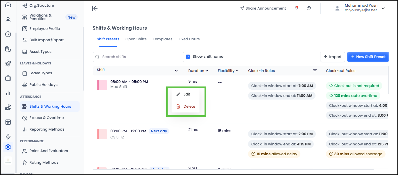 By clicking on the 3 dots next to the shift preset name > then clicking on the Edit option