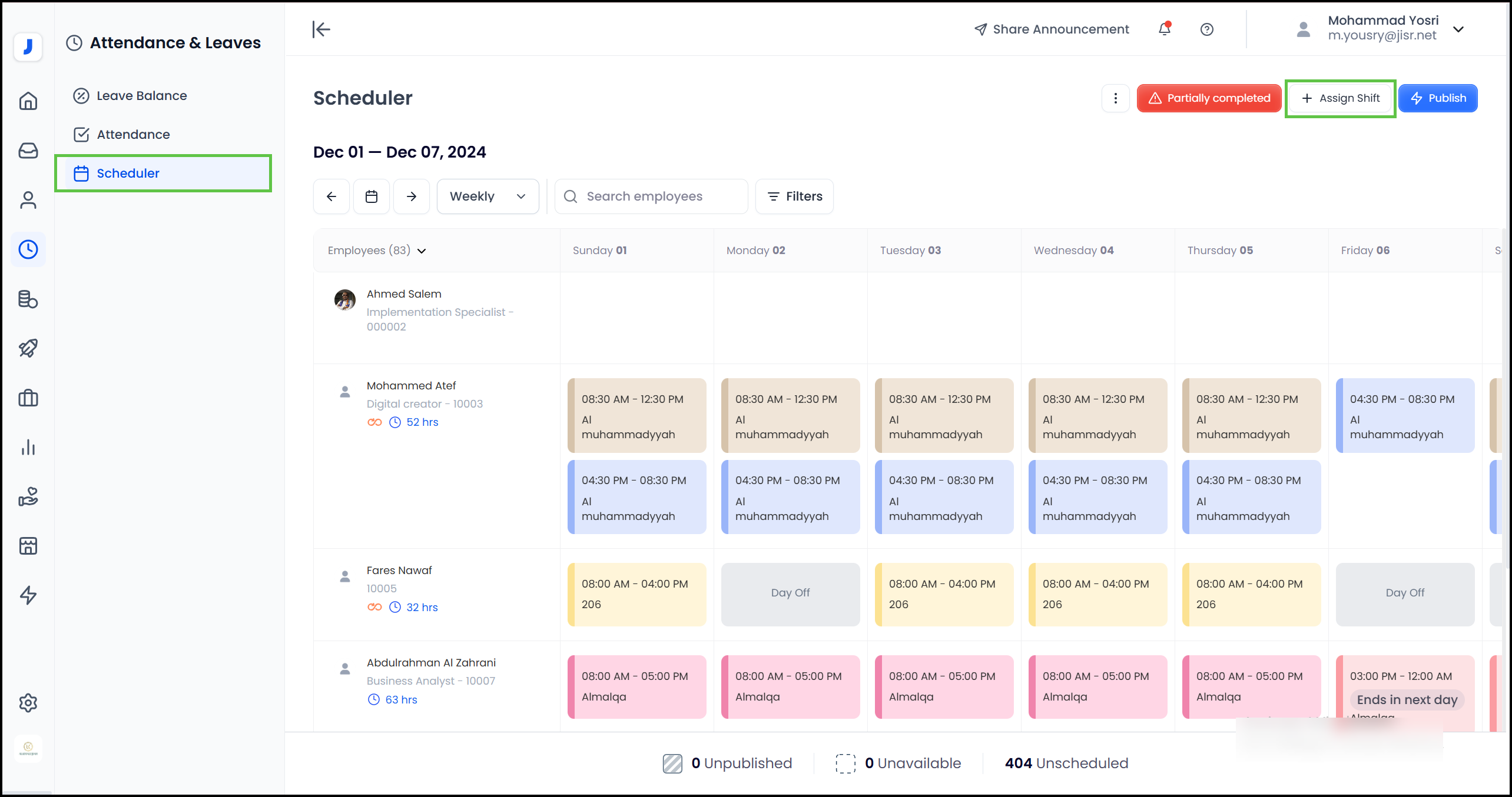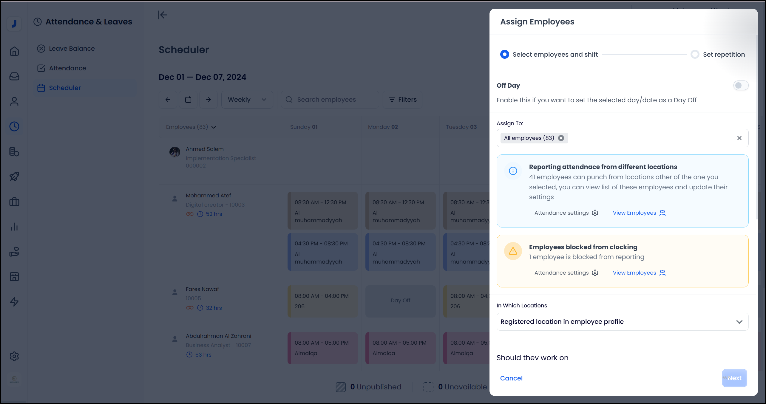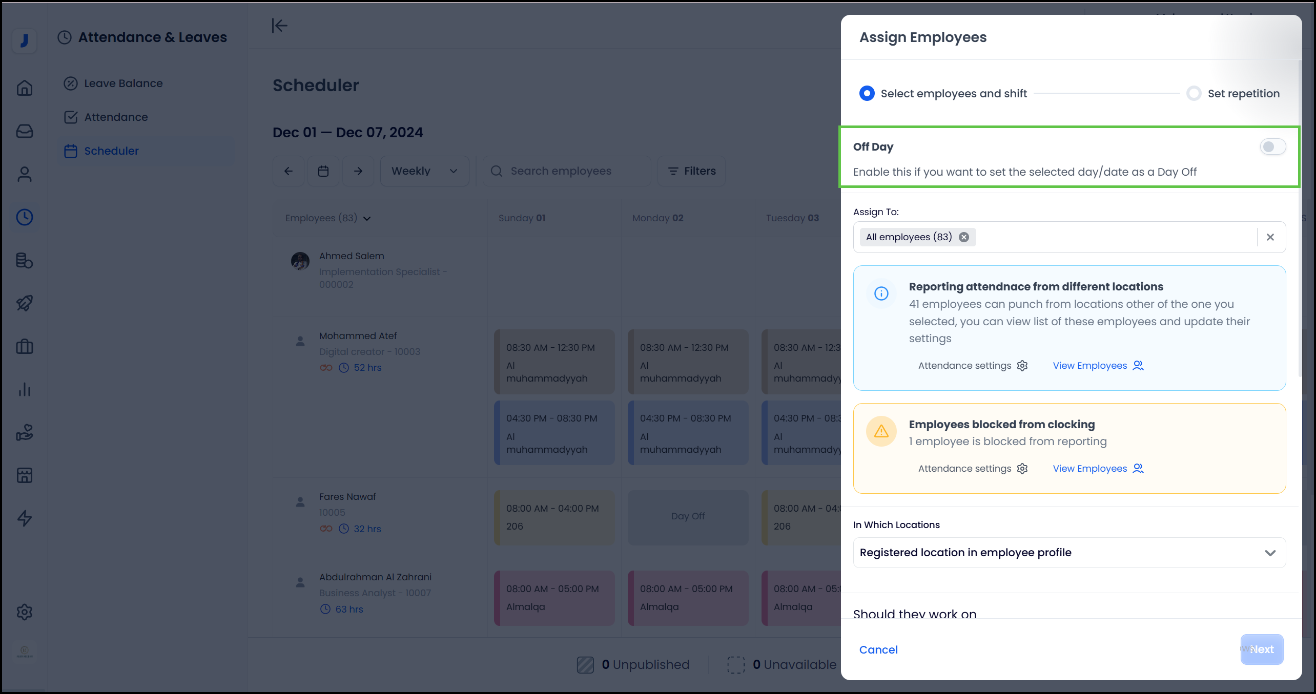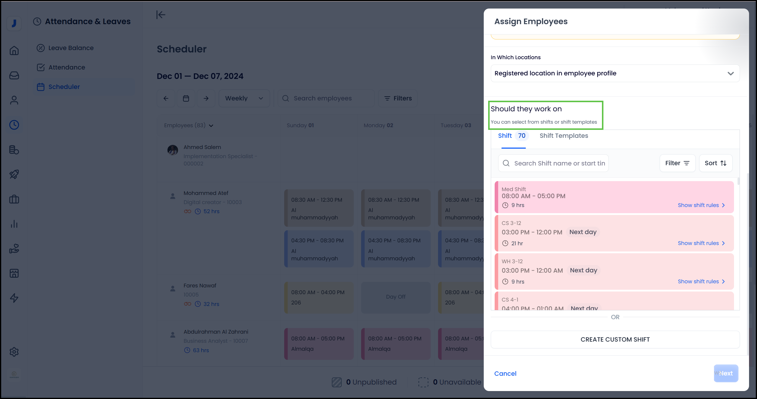 The admin or user responsible for scheduling employee shifts can assign the shift schedule to a group of employees or to all employees by following the following steps: