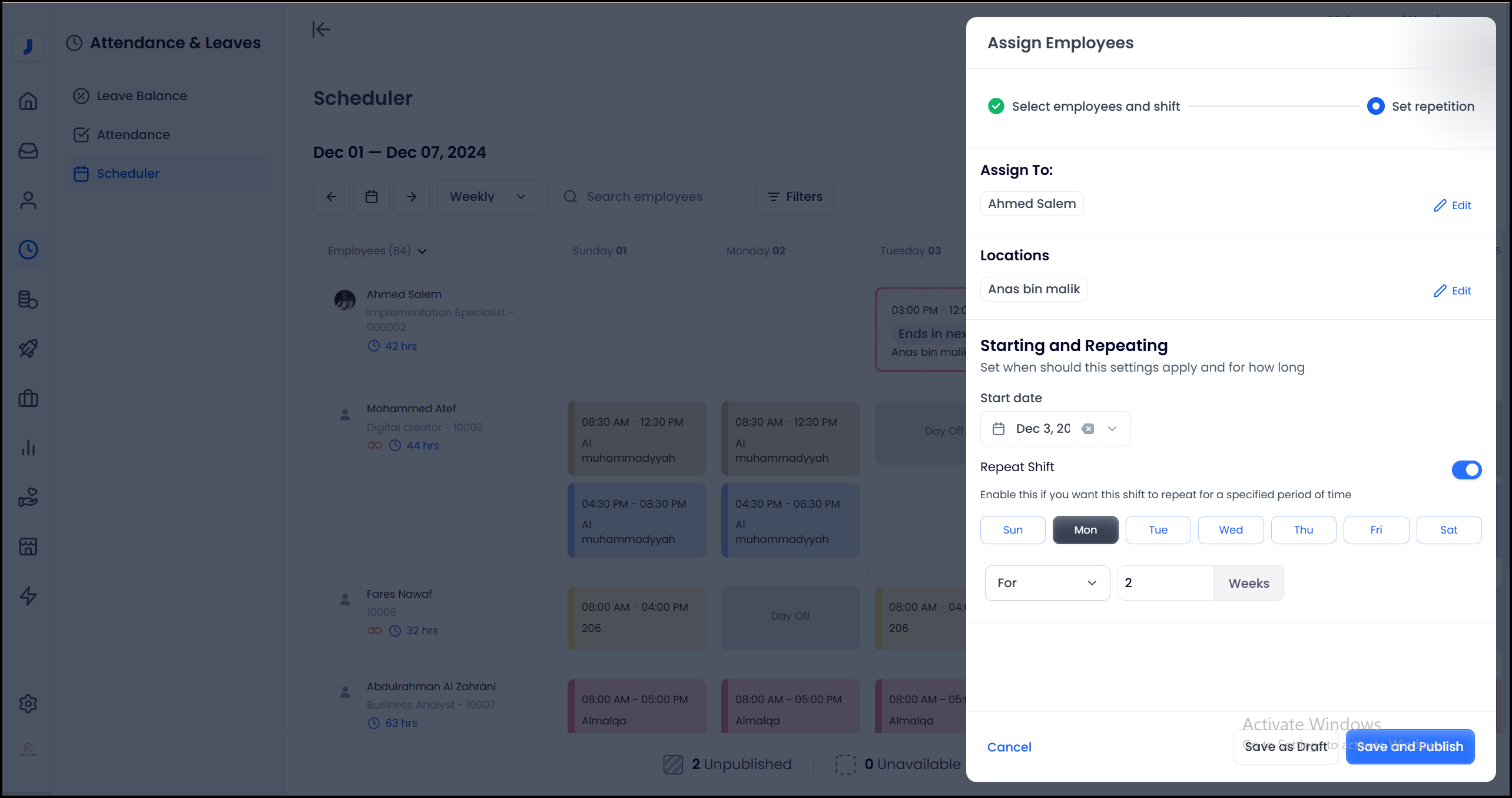 Enable the Repeat option if you want this shift to repeat for a specified period of time.
