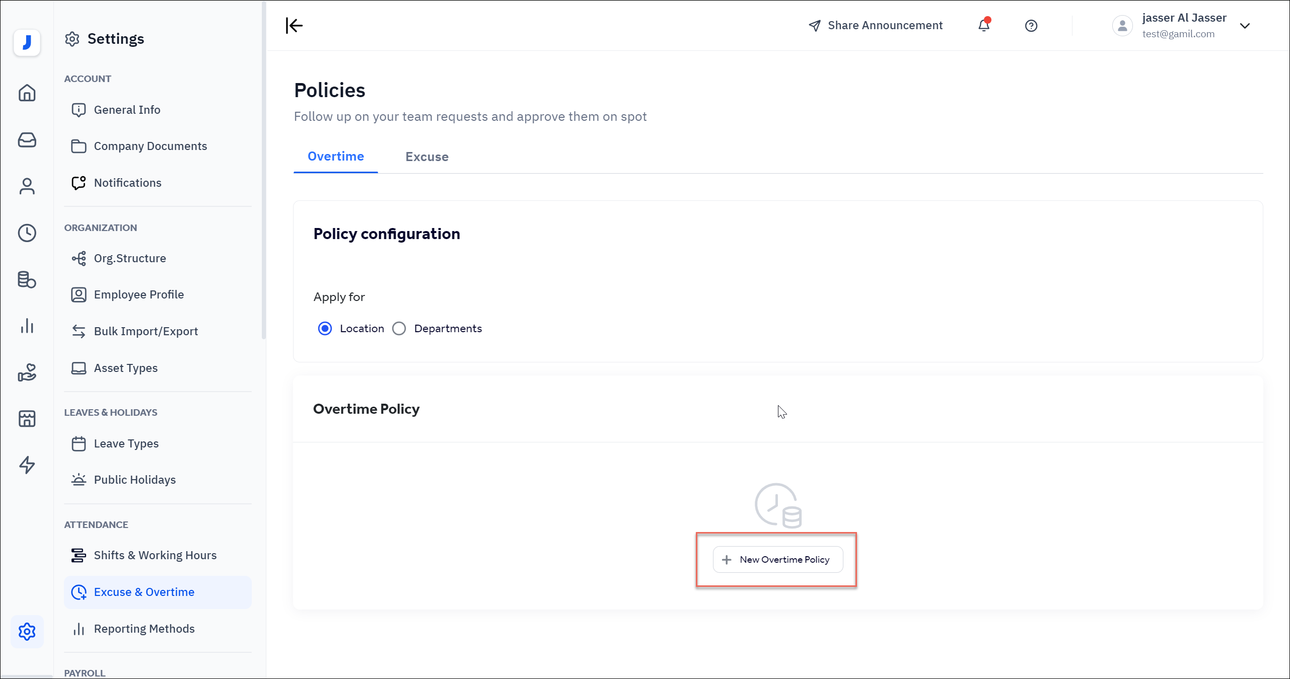 To do so, follow these steps: Go to Settings page > Attendance > Excuse & Overtime option > Overtime tab > select either location or Departments.