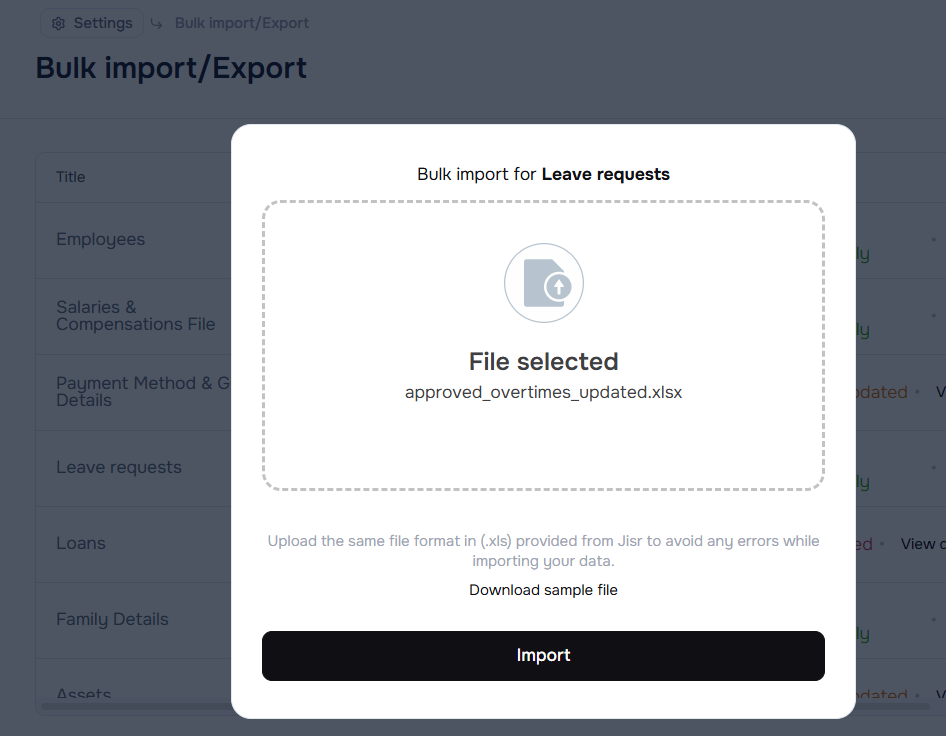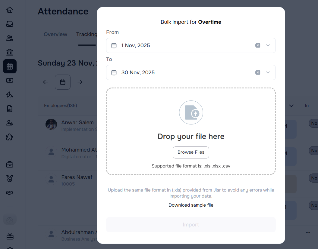 Under the Attendance & Leaves navigation tab, click on: Attendance Tracker. Select the Tracking Tab > Import > Overtime > Select duration to download excel template.
