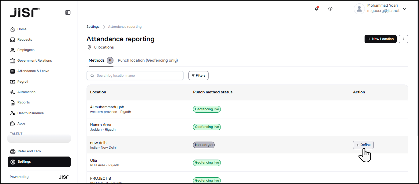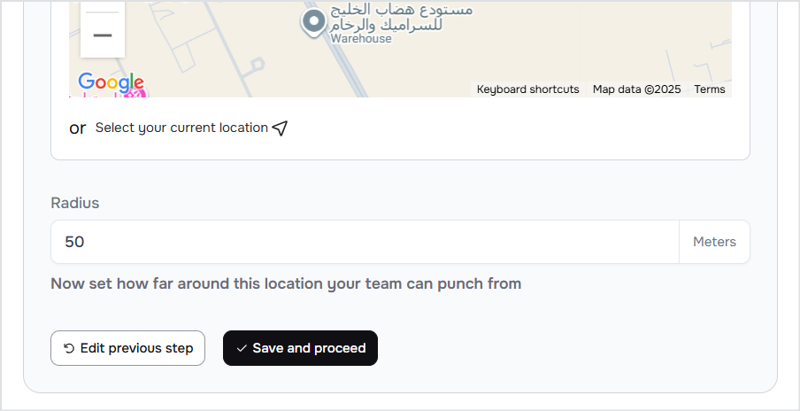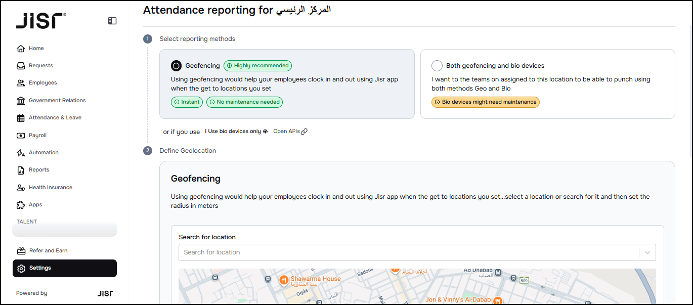 4- Select the required location from the list of work locations for the facility that have been previously defined in the system. From the map, accurately identify the selected work location and then define the circle surrounding the location, through which the employee is allowed to record attendance or departure.