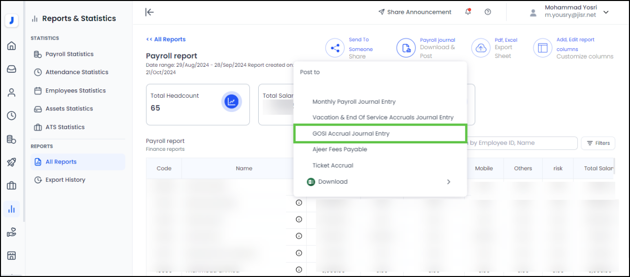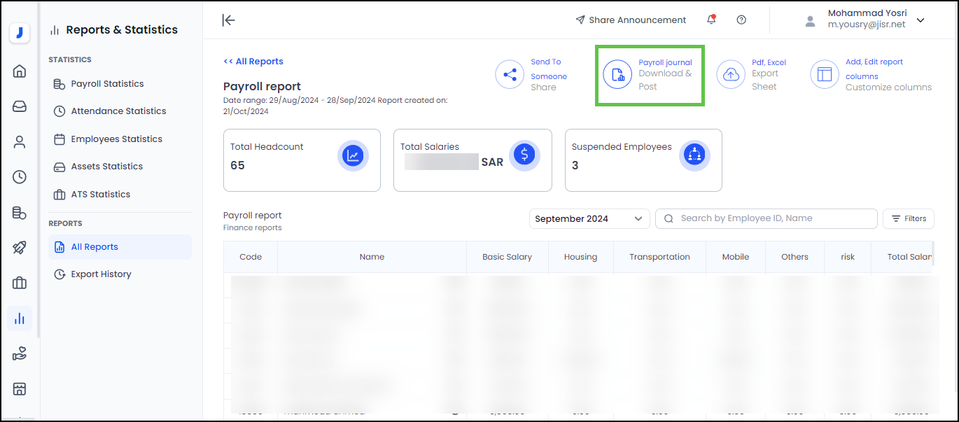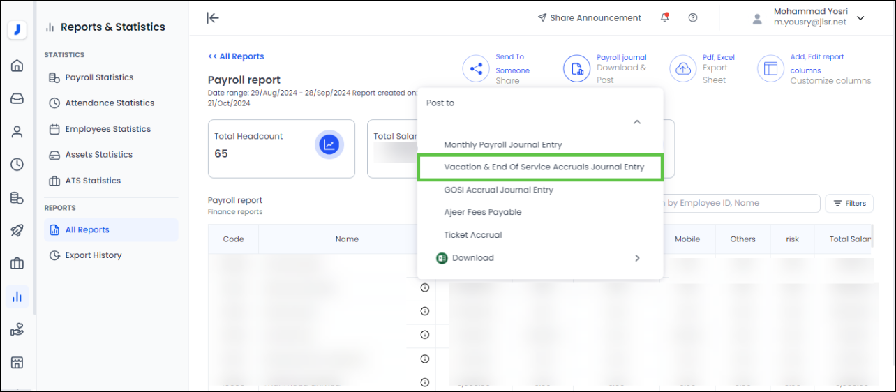 Once the integration setup has been completed, The admin or finance team member who has permission will be able to post the journal entries directly from Jisr to NetSuite, to ensure all transactions are logged to the GL accounts with less time and effort.