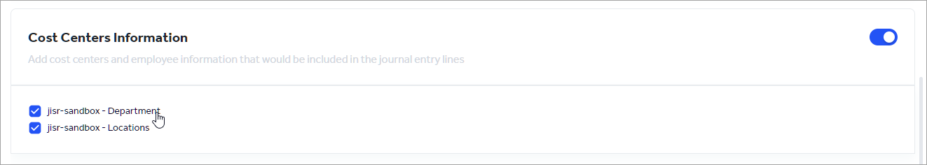 Once the admin activates this configuration, it would help to select required cost centers and employee information that would be included in the journal entry lines.