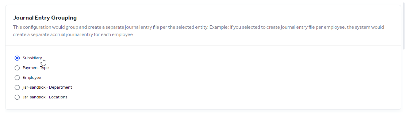 Example: if you selected to create a journal entry file per location, the system would create a separate accrual journal entry for each location.