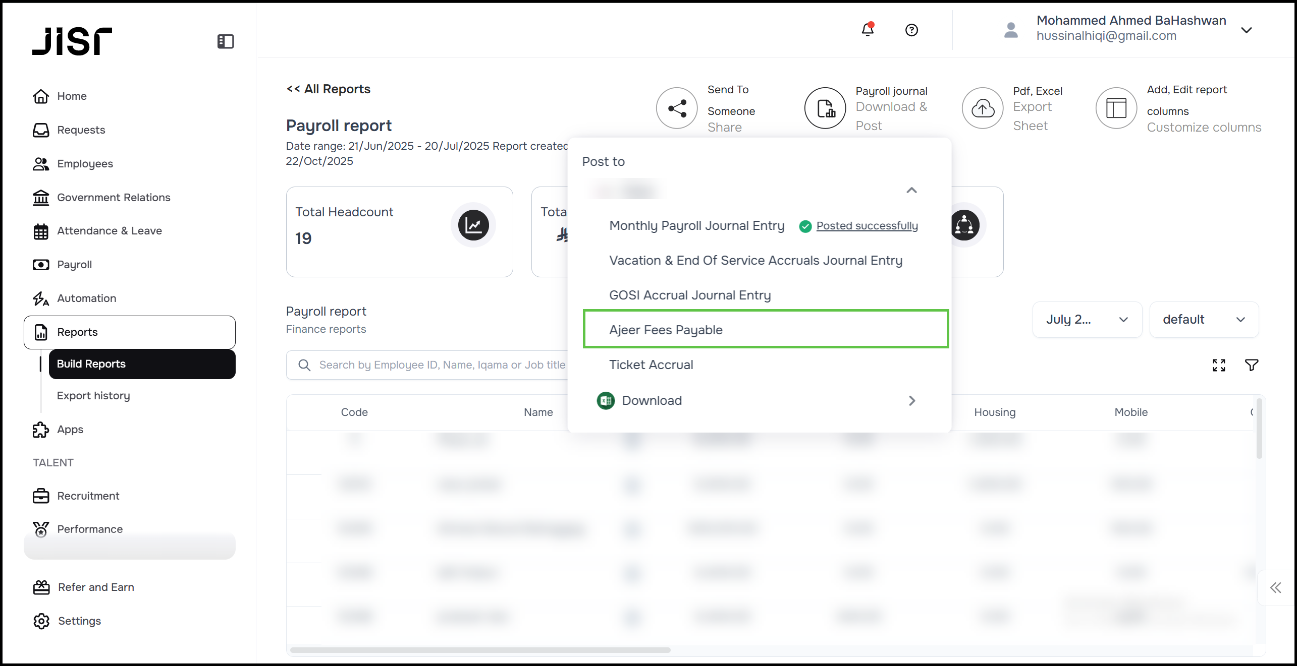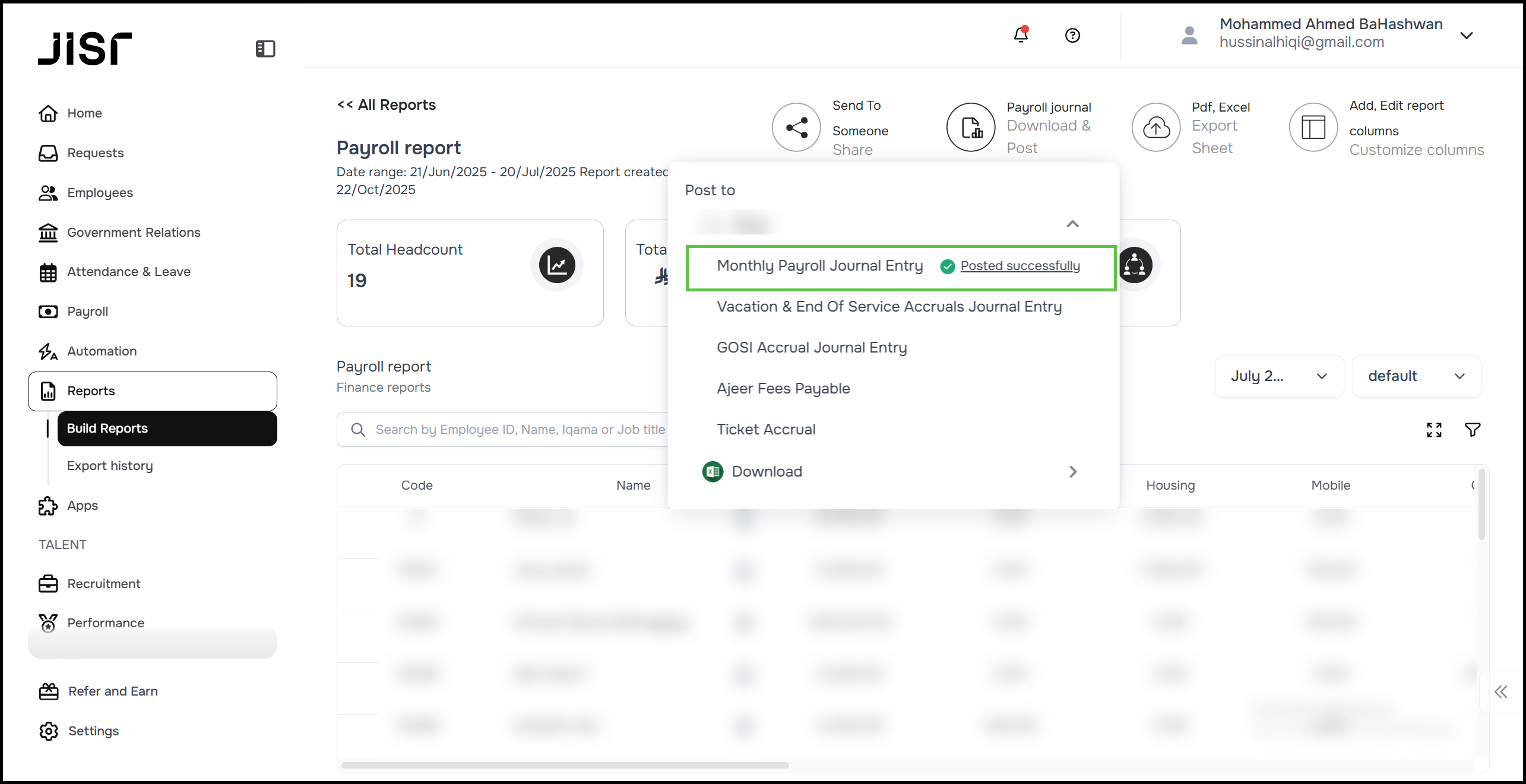 Once the integration setup has been completed, The admin or finance team member who has permission will be able to post the journal entries directly from Jisr to QuickBooks, to ensure all transactions are logged to the GL accounts with less time and effort.