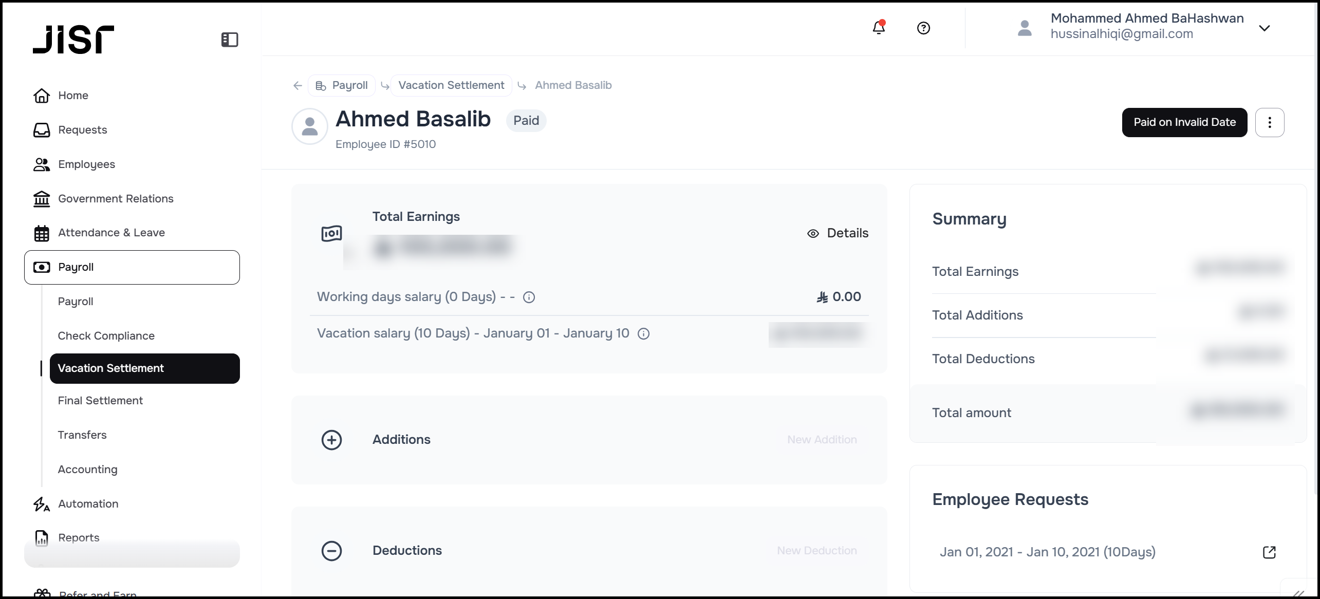 On the left side menu, Payroll > Vacation Settlement > Approved or paid Tab > Select the required Settlement > click on View details.