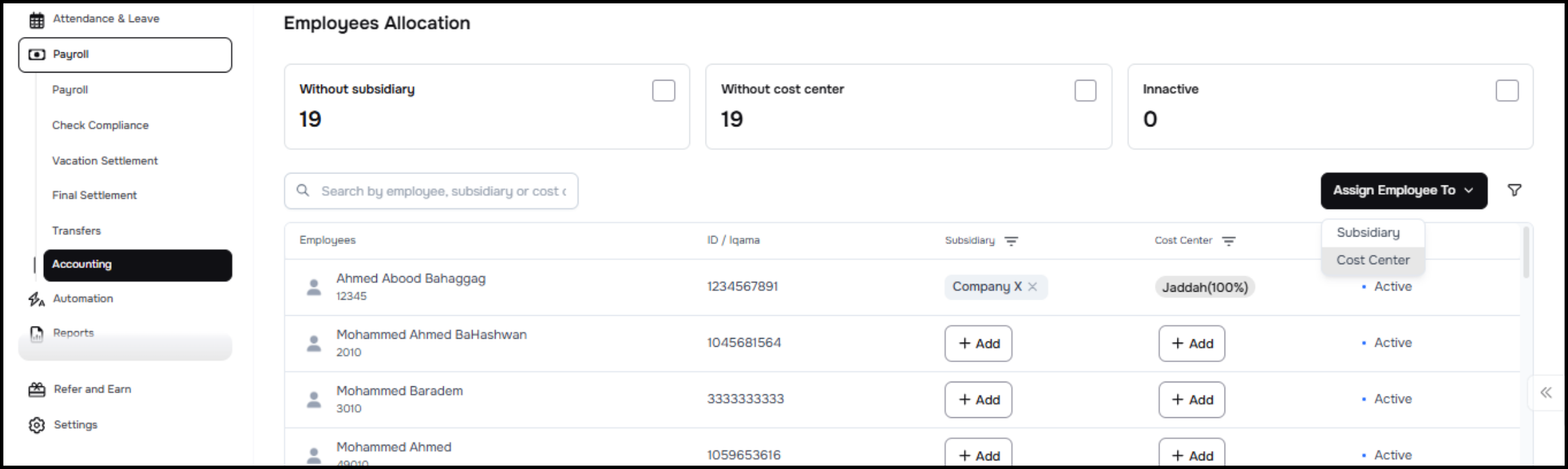 In the Employees Allocation step, the admin can review and assign the cost center to employees in order to avoid missing any employees while setting up the integration.