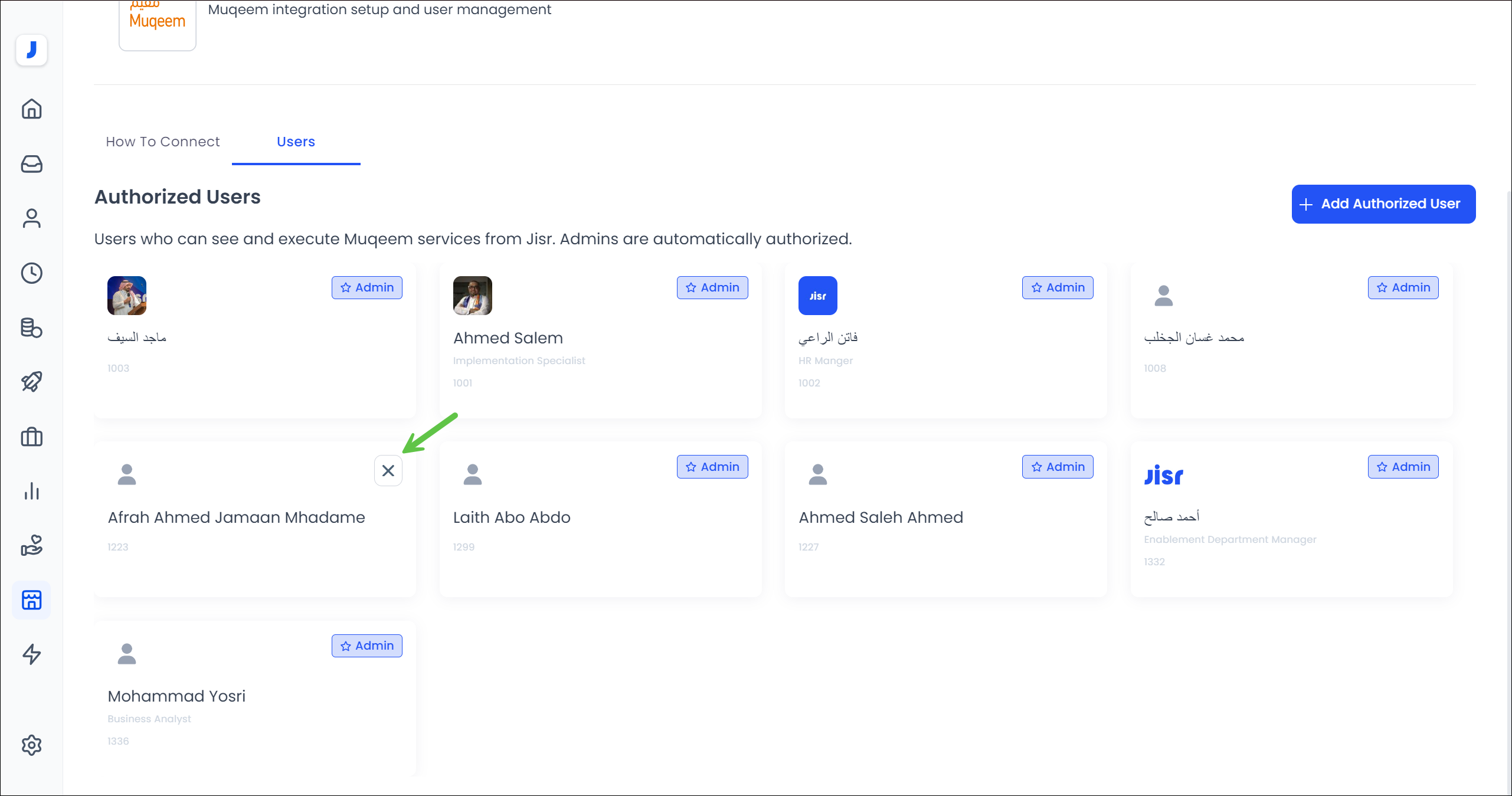 3. You will have access to the page where all admins' names will be displayed; all displayed names have default permission to execute and manage employees' Muqeem services from Jisr.
