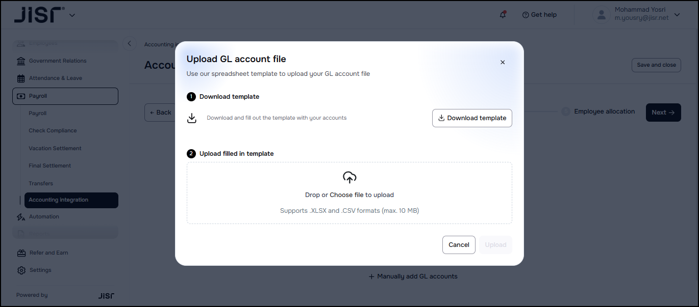 This method is helpful if you're setting up the COA accounts for the first time on Jisr.Go to settings >> Accounting integration >> file based integration >> Chart of Accounts
