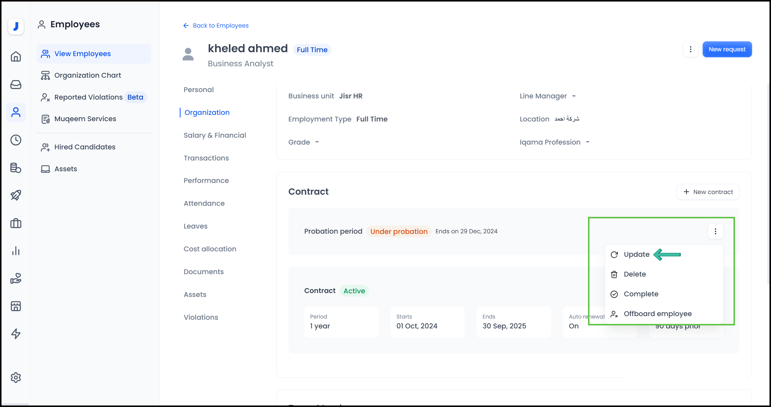 Through the system, the admin can modify, extend or reduce the employee’s trial period, which is usually 90 days and does not exceed 180 days, by following the following steps: -