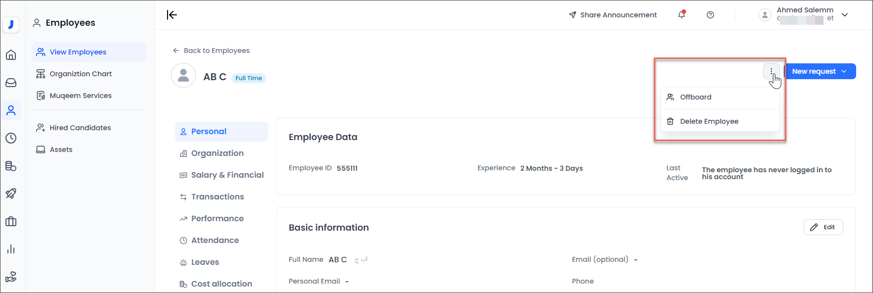 It is necessary to enter and save the employee's email address (work or personal) in their profile. This will enable the admin to send an invitation to the employee to log in to the system. The admin can do this by clicking on the "Invite " option located at the top of the employee's profile page.