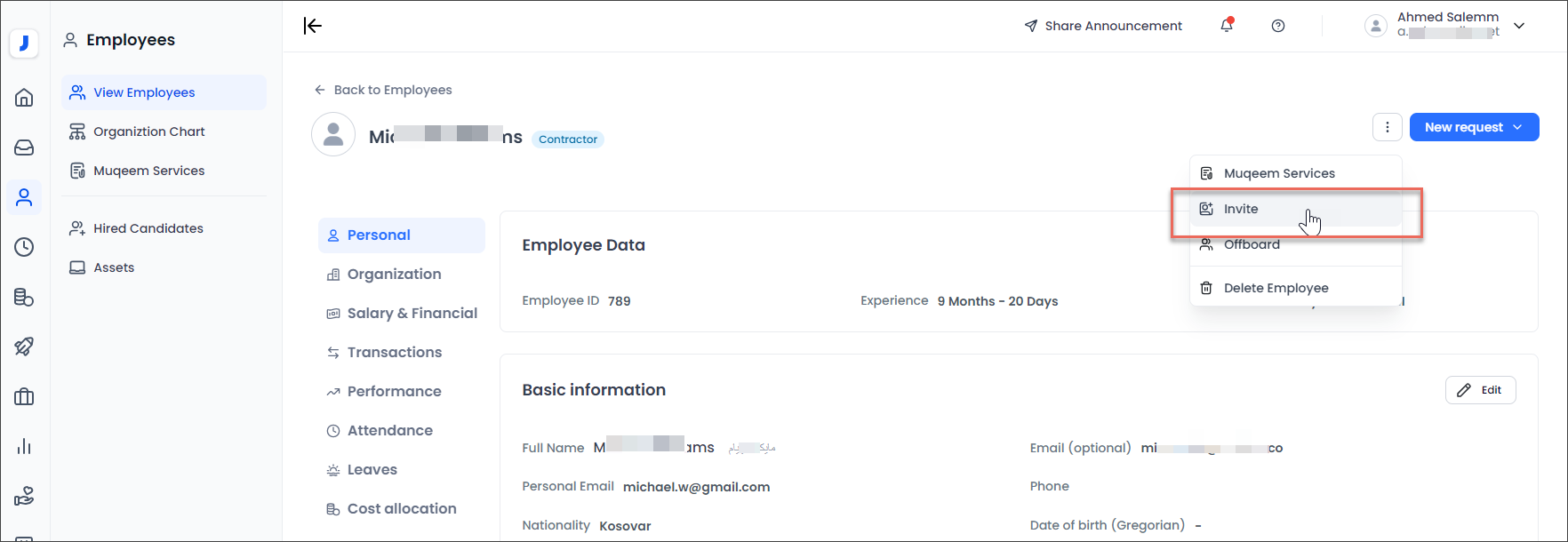 2. The "Invite" option will not be available if you lack permission to manage personal and Org. information or if an email address has not been added to the employee's profile.