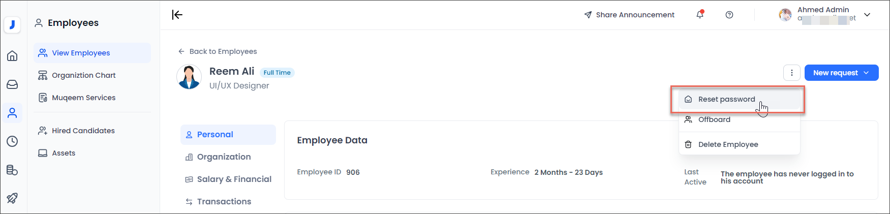 1. If an invitation is sent to an employee and they are unable to log in to the system, the admin can reset the password by clicking on the "Reset Password" option located at the top of the employee's profile page."