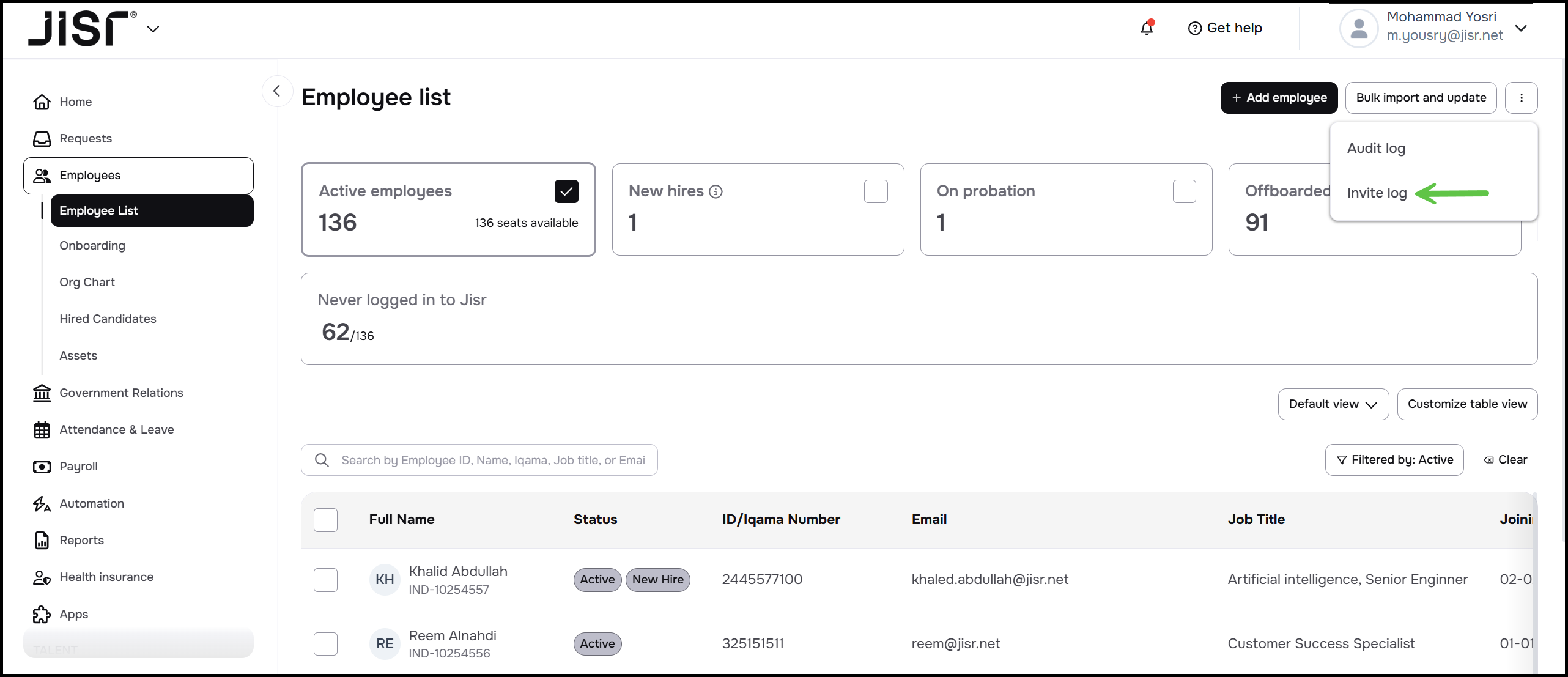 It is necessary to enter and save the employee's email address (work or personal) in their profile. This will enable the admin to send an invitation to the employee to log in to the system. The admin can do this by clicking on the "Invite " option located at the top of the employee list page.
