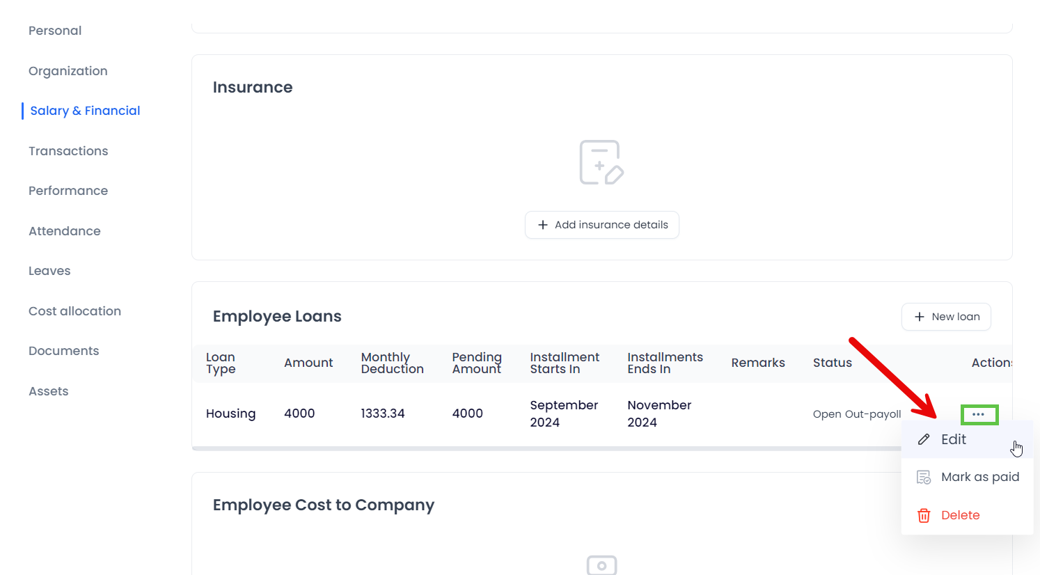 1- A new loan can be added directly to the employee without going through the approval process by selecting the (+New loan) option.