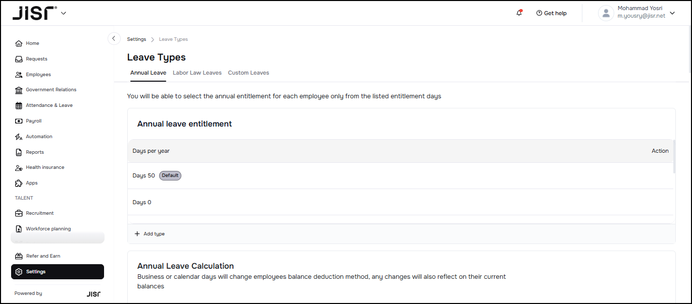 According to the text of Article 109 of the Labor Law, the annual entitlement of employees in the facility must be defined in advance on the Jisr system by the system admin, so that he can later allocate the annual entitlement to each employee independently based on the employment contract or the internal regulations of the facility, in order to ensure the automation of the processes of calculating annual leave balances for employees correctly.