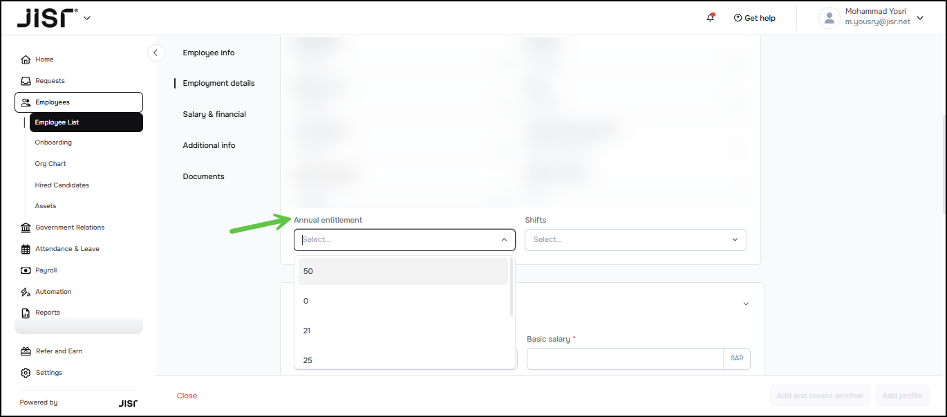 Defining or updating the annual entitlement for employees: