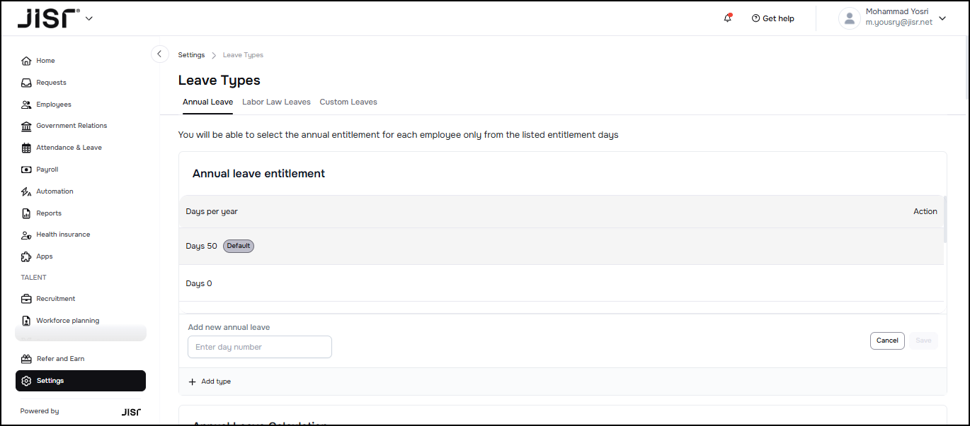 2- From the Leaves Types page (in the left side menu) of the system > Annual Leave tab > Add Type > Enter number of days > Save:
