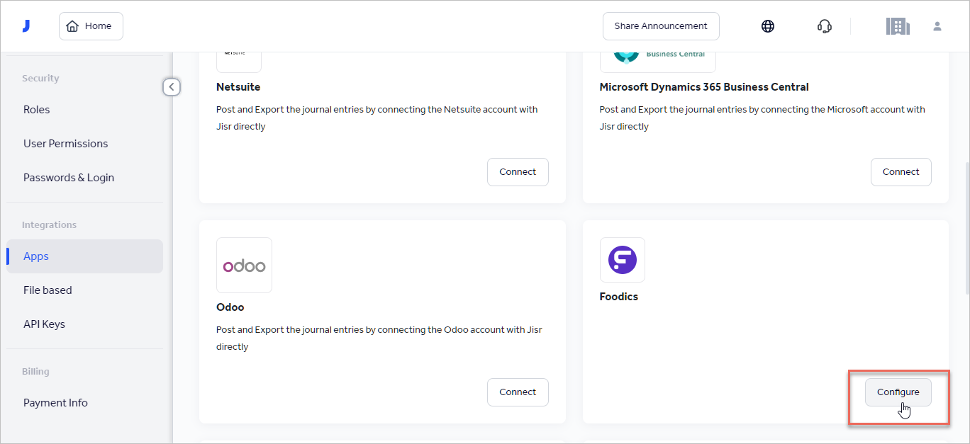 Go to Settings page > Integrations > Apps > Foodics > Configure