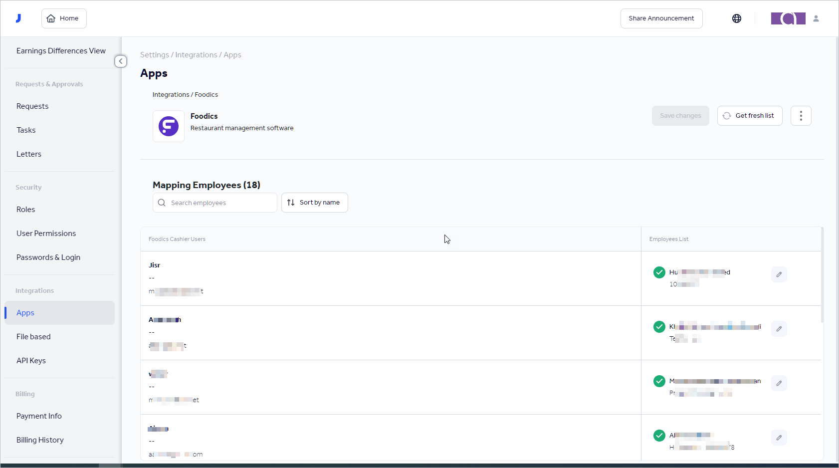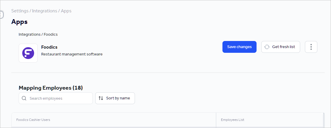 Once your Foodics account is connected, Jisr will get the list of cashier users from your Foodics account so you can map them with your employees list in Jisr.
