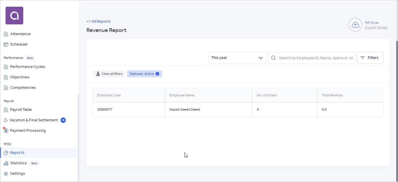 This report shows the total revenue for your employees as per employee's closed orders in your Foodics account.