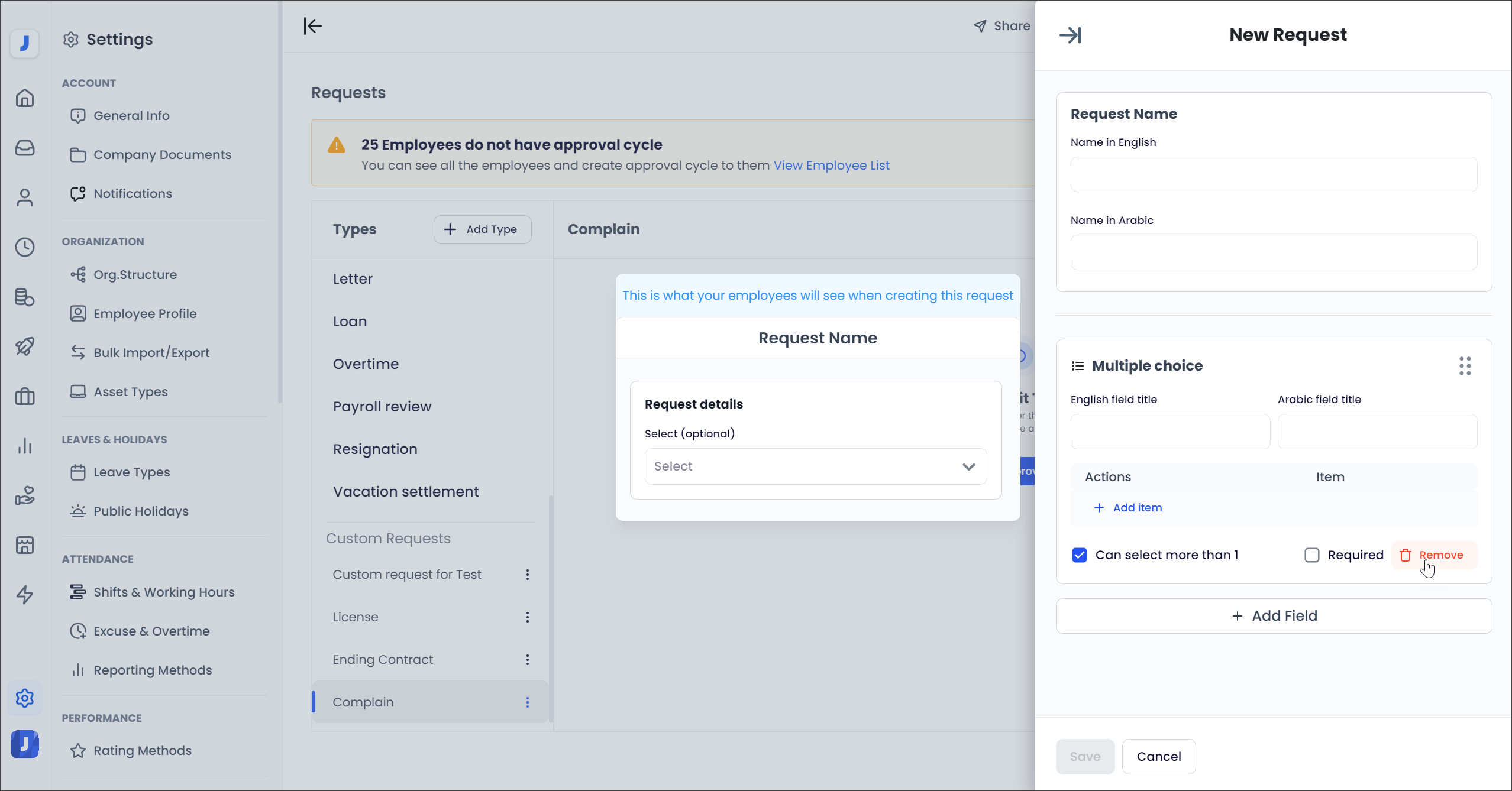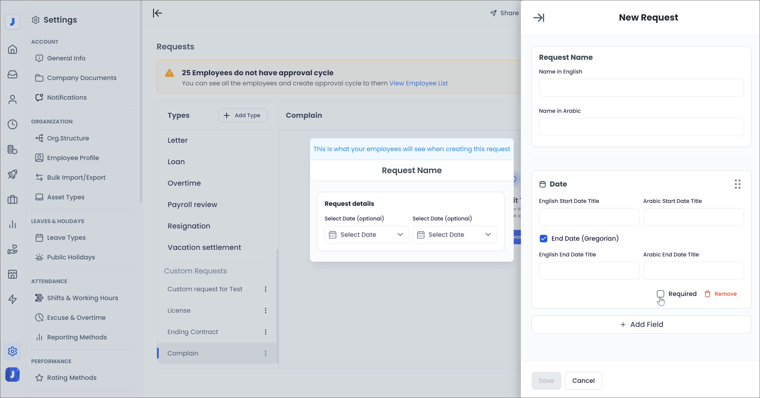If the default employee self-service (ESS) request types available on Jisr HR are not satisfactory, the admin can add custom request types to Jisr HR according to business needs or other requirements.