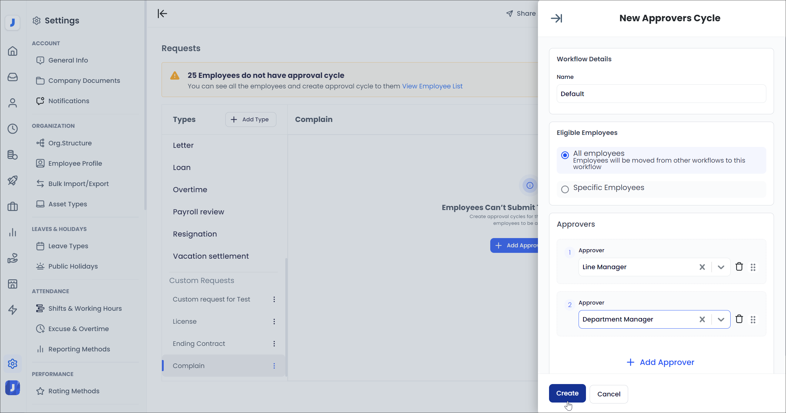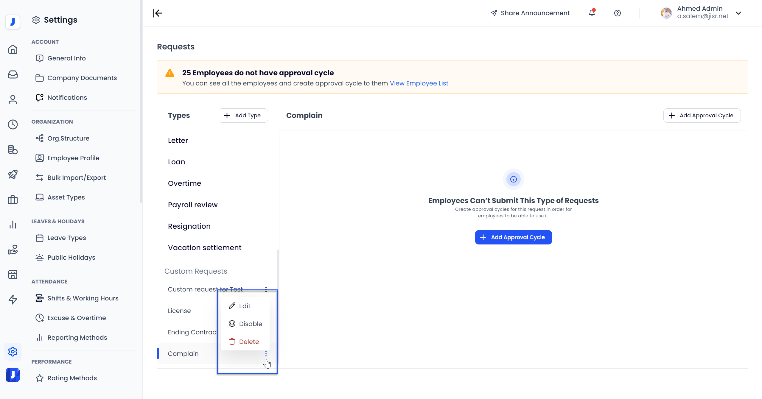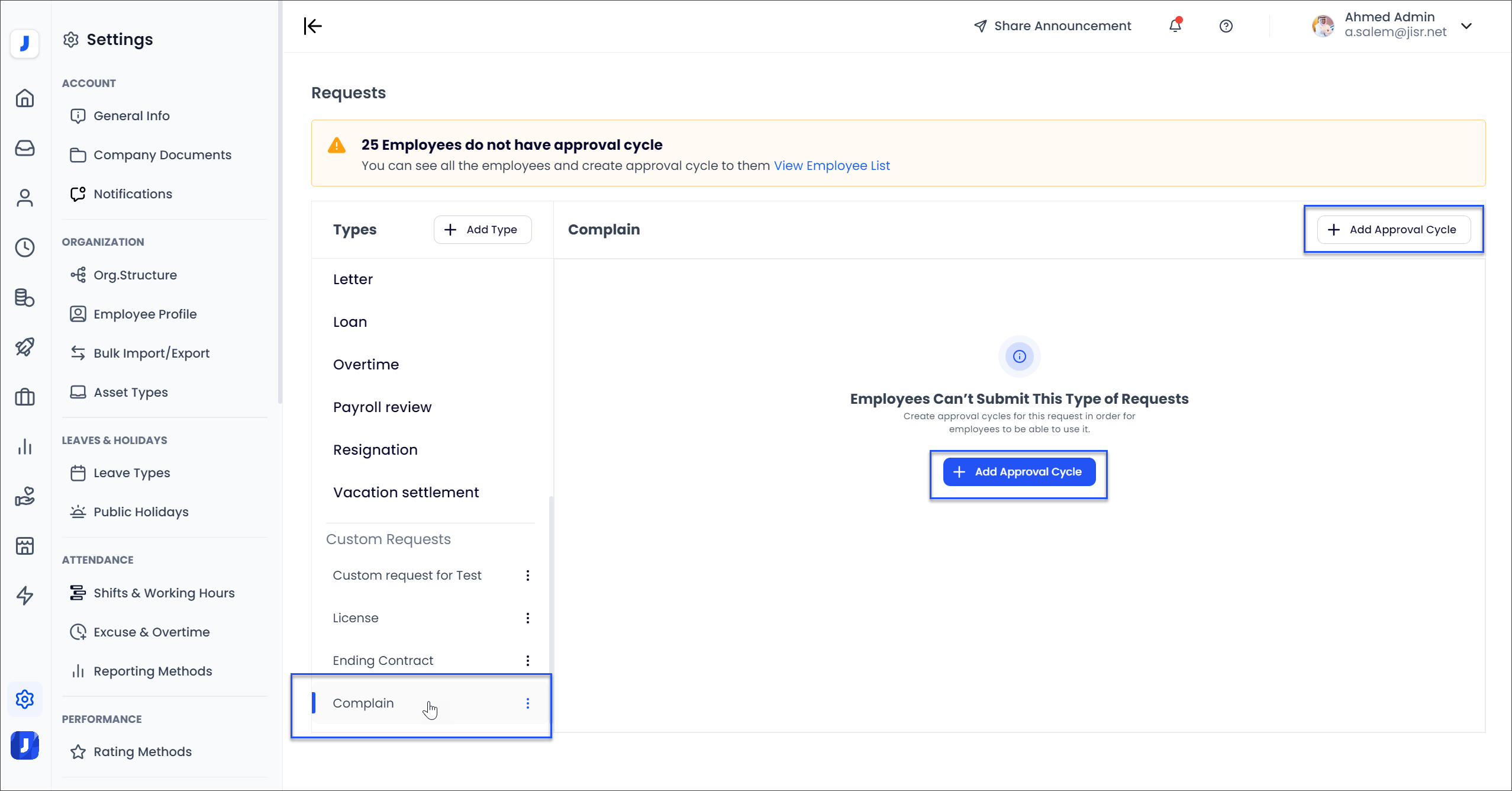 In order for employees to be able to use this type of Request, the admin should complete the journey by creating workflows for this request by clicking on ( Add Approval Cycle ).