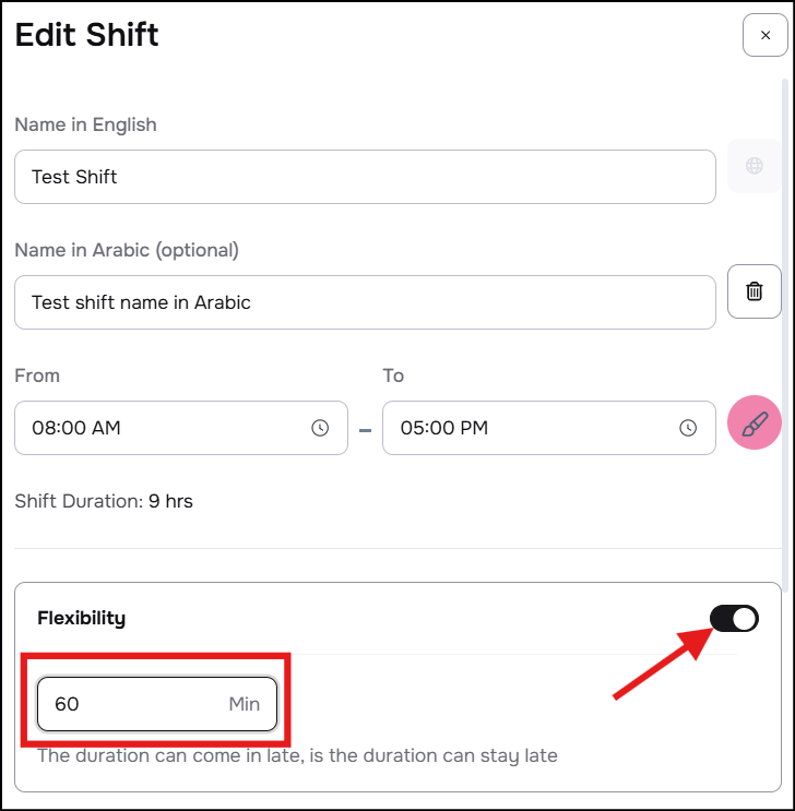 - In the new shift details, activate the toggle next to the Flexibility option, which will display a field for entering the allowed flexibility time in minutes.