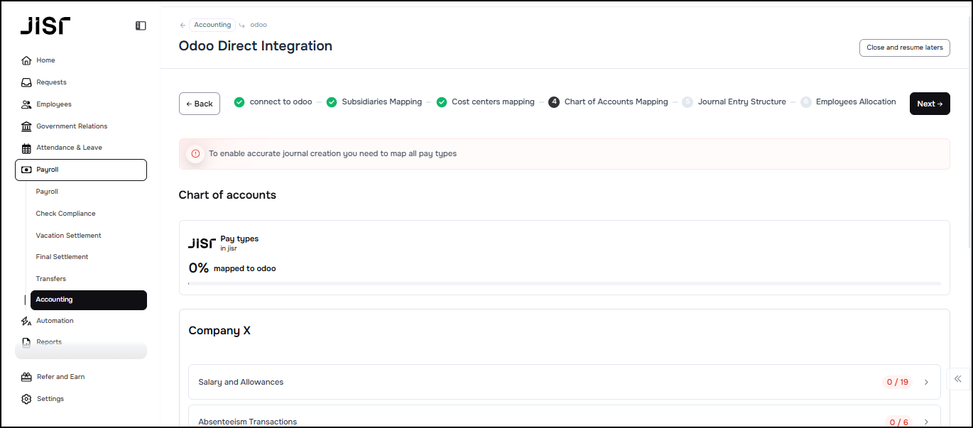 In this step, The admin can map the Odoo chart of accounts to Jisr transactions for specific subsidiary, so that any transactions that happen in Jisr will get posted to the appropriate accounts on the chart of accounts.
