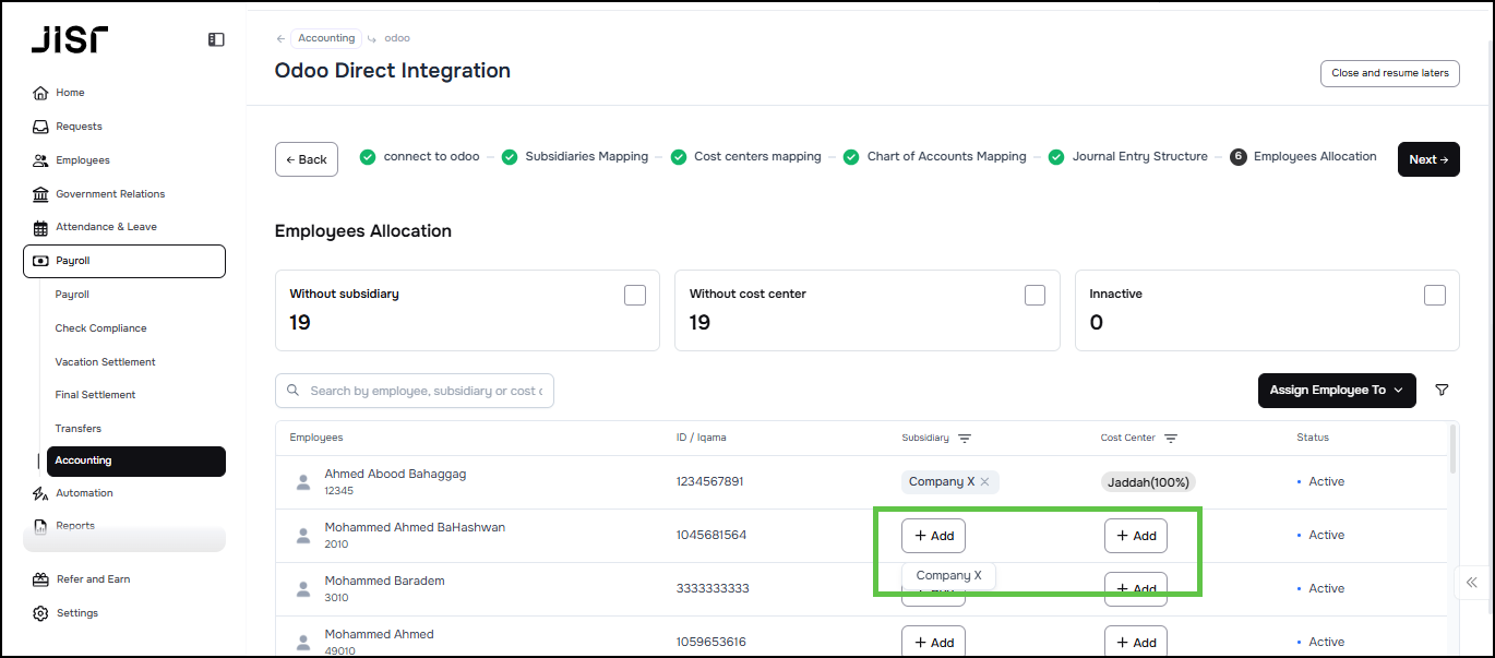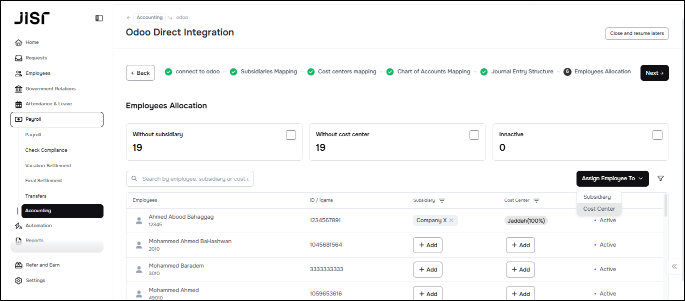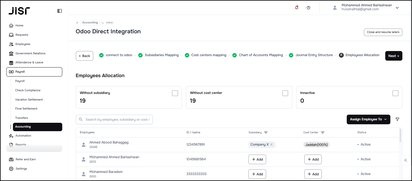 In the Employees Allocation tab, the admin can review and assign the cost center ( Analytic Items ) to employees in order to avoid missing any employees while setting up the integration.