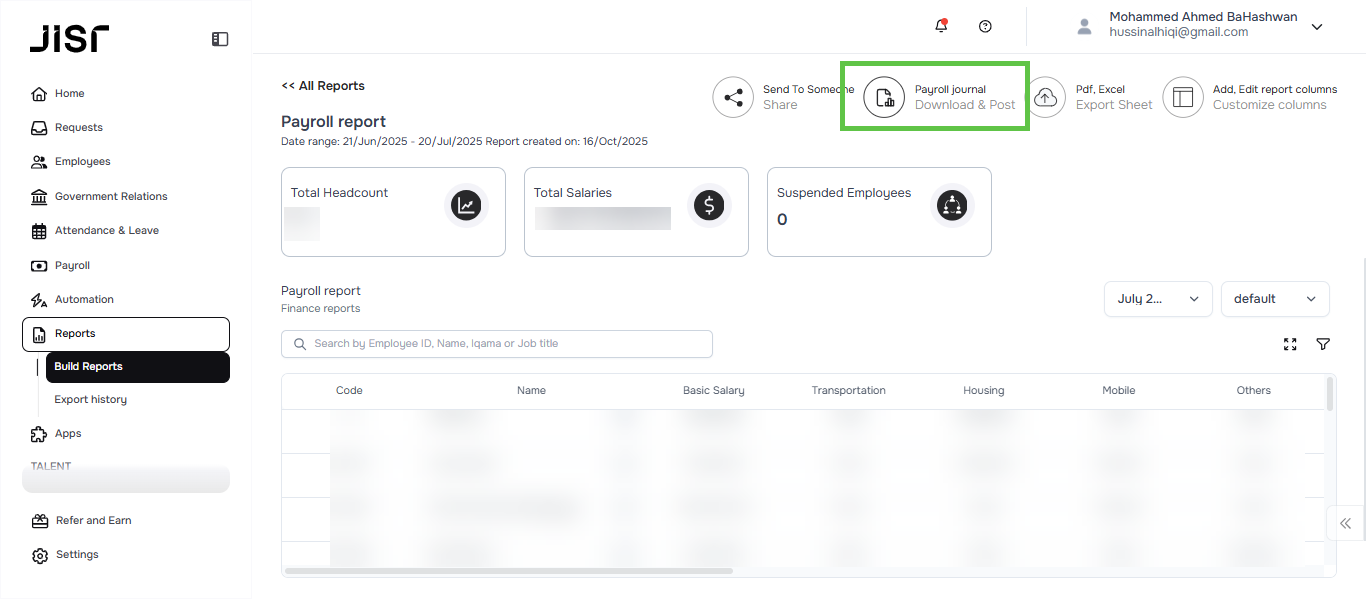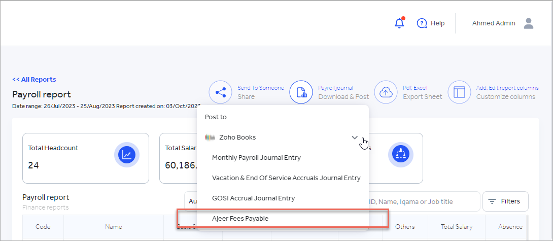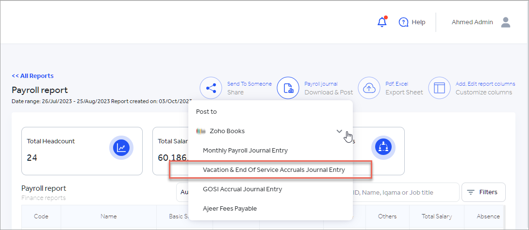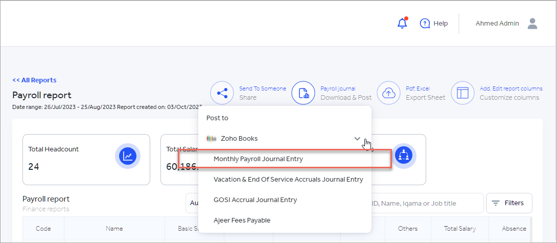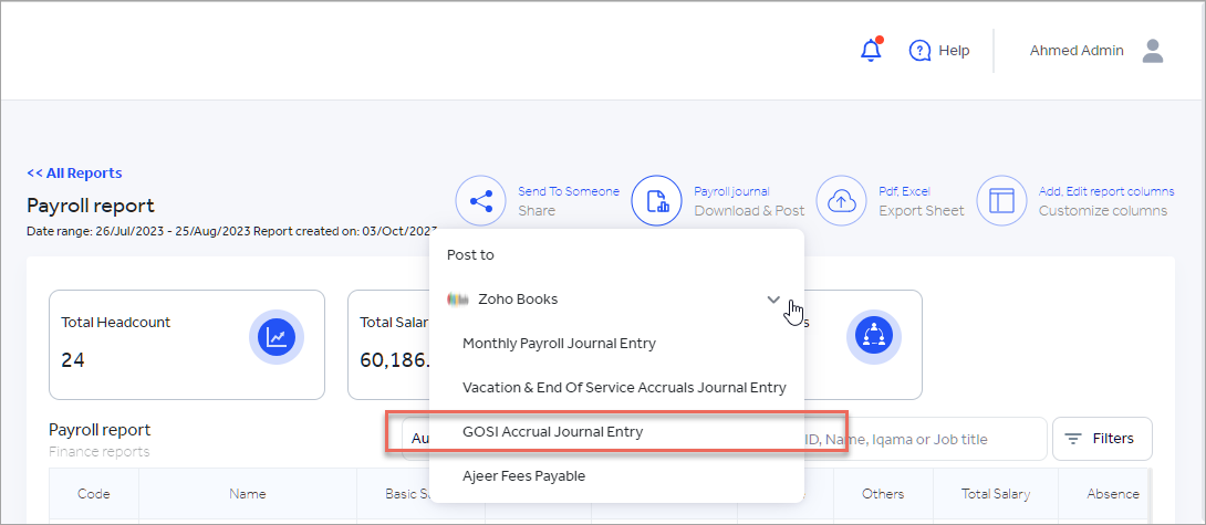 Once the integration setup has been completed, The admin or finance team member who has permission will be able to post the journal entries directly from Jisr to Zoho Books to ensure all transactions are logged to the GL accounts with less time and effort.