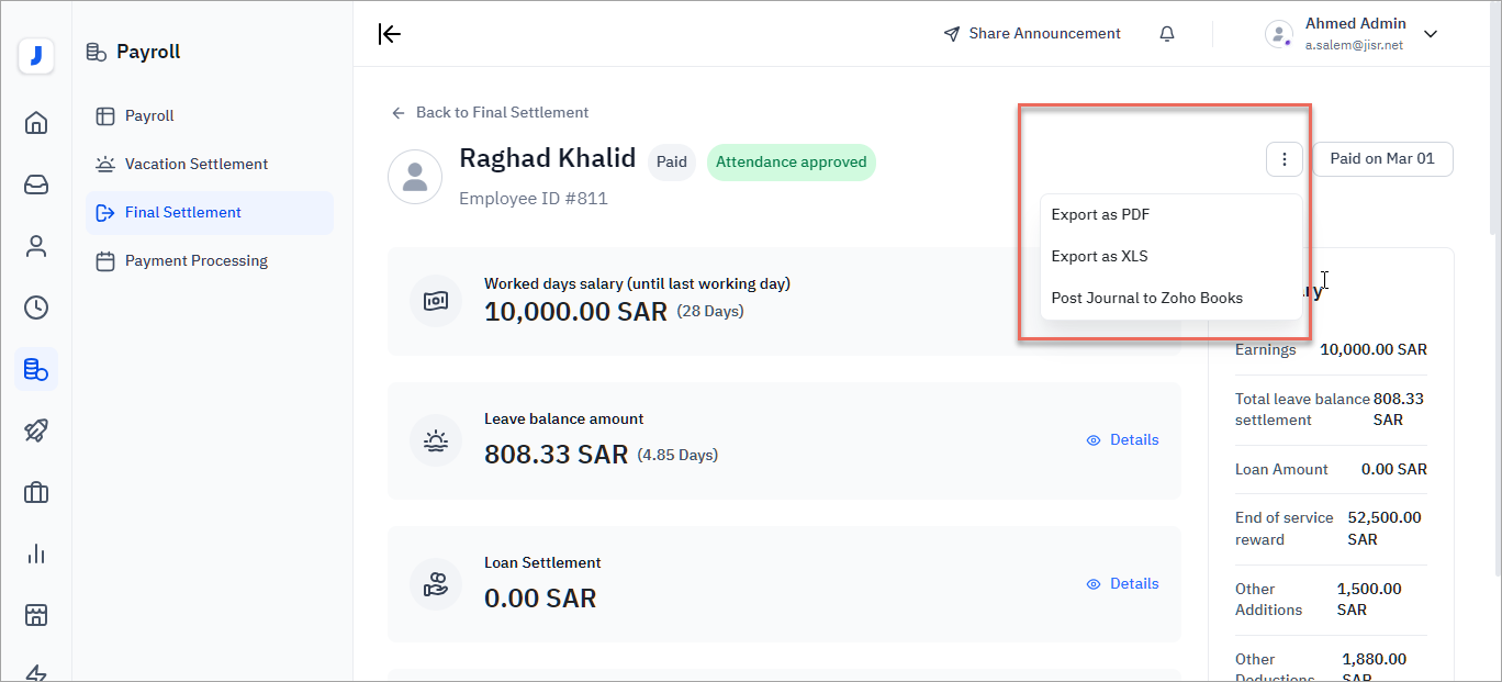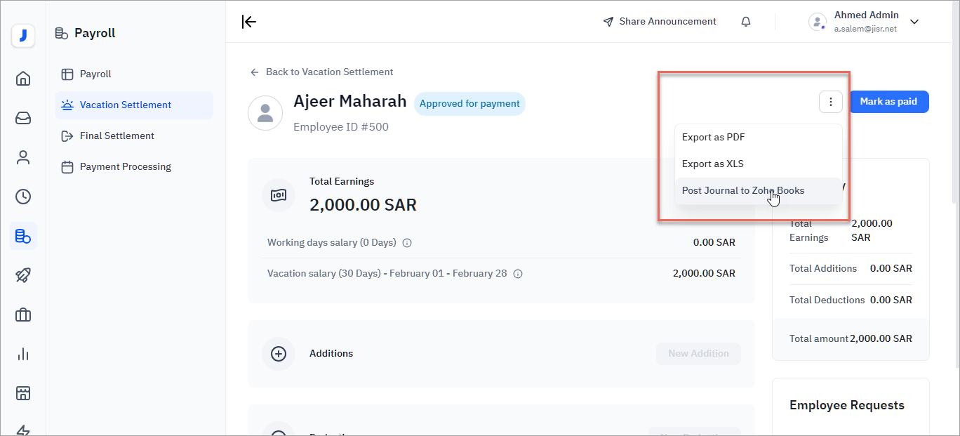 On the left side menu, Head over to Payroll > Vacation Settlement > Select the required Approved Settlement > Click on the View details > Click on 3 vertical dots & select Post Journal to Zoho Books.