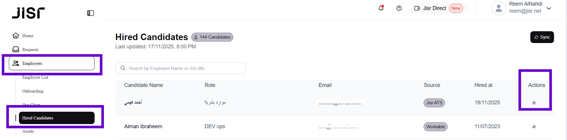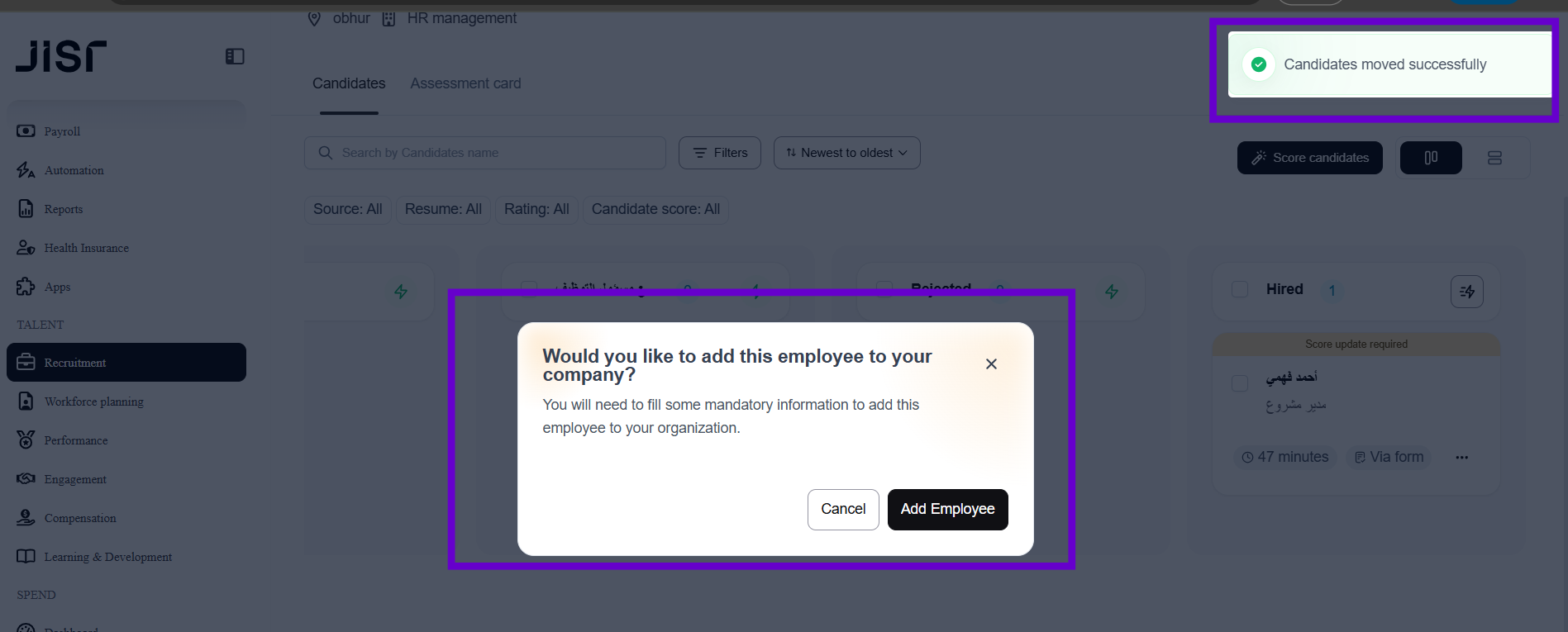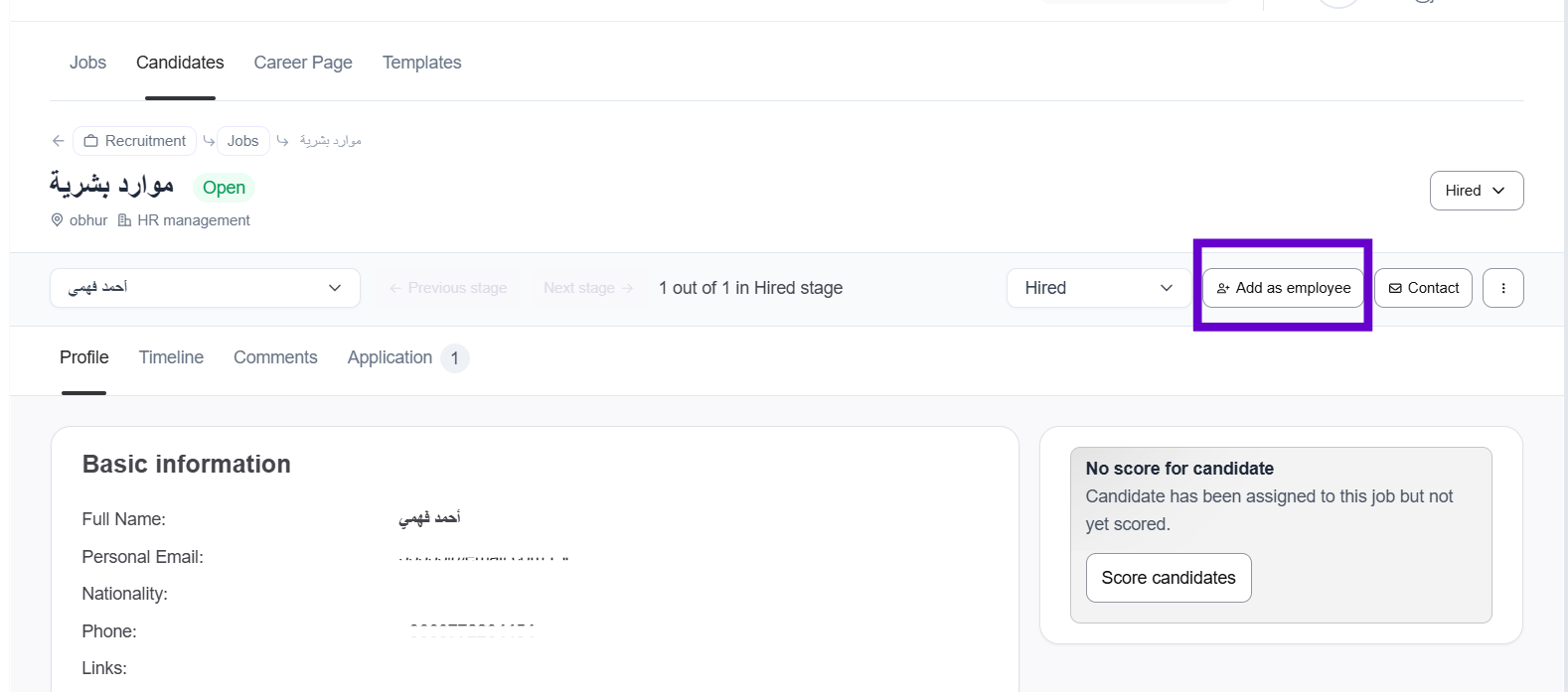 2- On the Candidates page in Jisr ATS, When moving a candidate to the final hiring stage ( Hired ), the option to add them as an employee will be displayed.