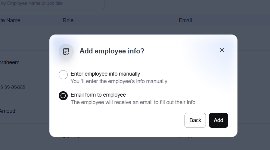 Or by sending an invitation to the employee so they can fill in their information. For more details, check out the Sending the Onboarding Invitation to New Employees article