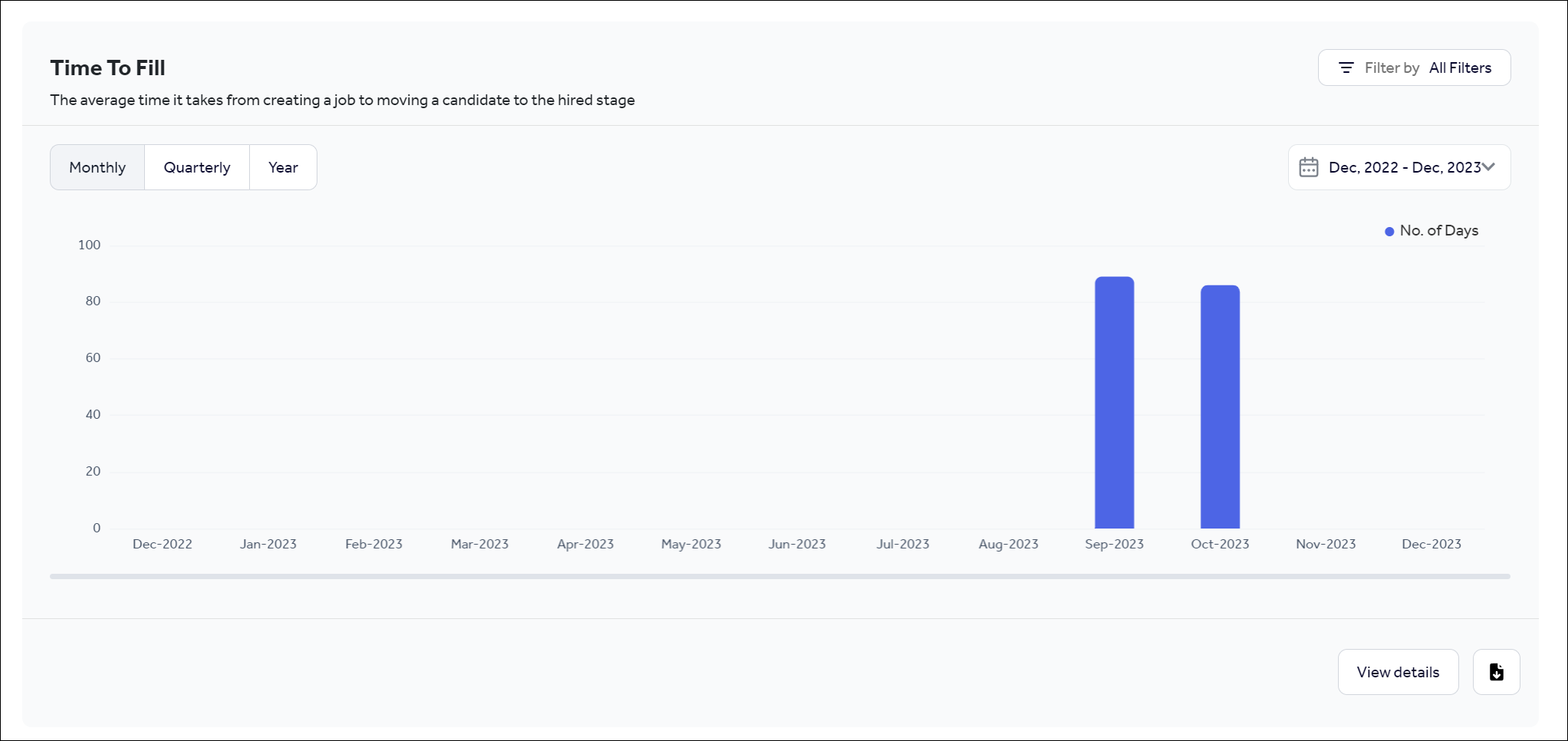 Measures the number of days it takes to fill an open position, from the date the hired candidate enters the applied stage to the date a new hire accepts the position.