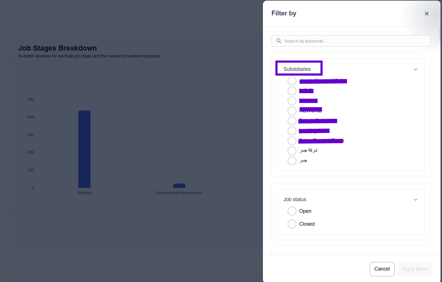 If a subsidiary is related to the company and has ATS, the admin can view the job stages for that subsidiary by filtering by the company name.