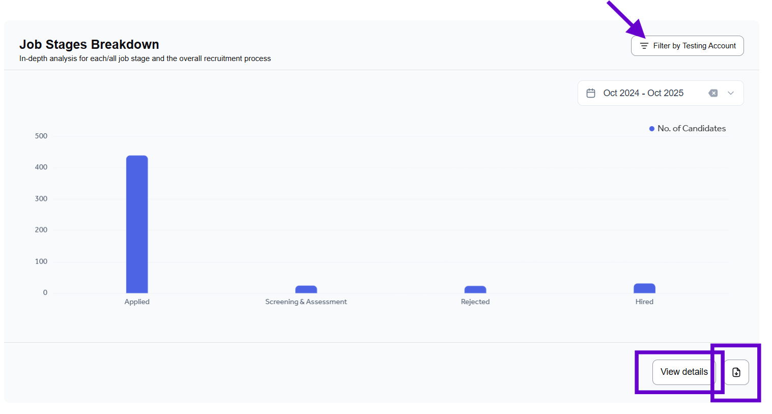 This bar chart shows the number of candidates at each stage of the hiring process. It displays applicants in the Applied, Screening & Assessment, Hired, and Rejected stages.